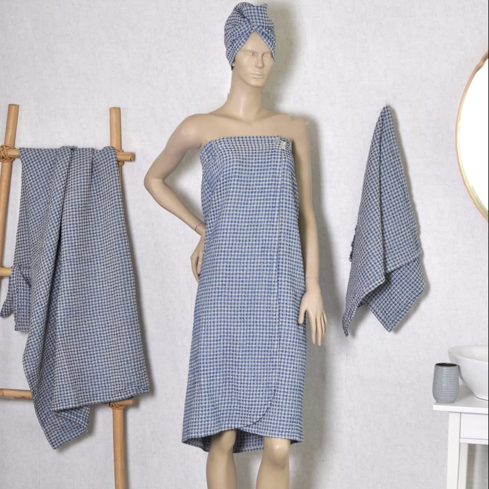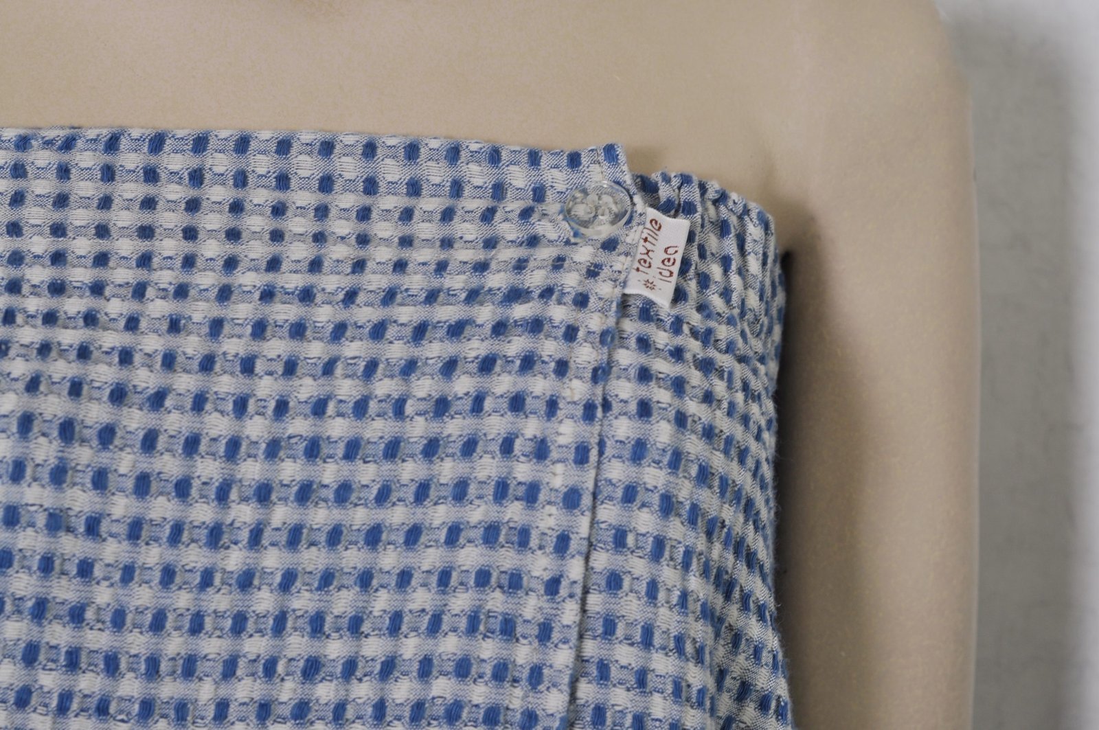 Blue waffle female bath apron for cotton and flax fabric She likes sauna, naturality and comfort. Stitched at the chest with wider rubber, adjusting the width, length to several bath aprons are designed to maximize the harmonisation of the beneficial properties of the fabric and ease of wear. This sauna apron: