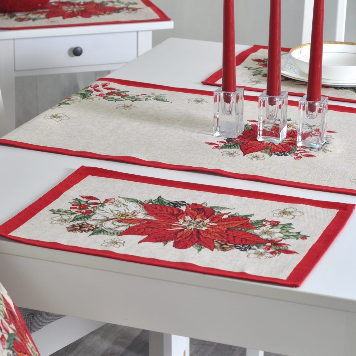 Fibre, elegant, solid tapestries table napkin Red Poinsettia decorated with Christmas motifs. This is a wonderful, delicate and memorable Christmas present. These table wipes combine table tracks, tablecloths and decorative pillows from the same collection. We invite you to look at other items of this collection and choose a set to decorate the interior of the house according to your needs. See table tracks whereThe different sizes of tablecloths are in this shelves, o decorative pillow covers where. Maintenance: We recommend cleaning table wipes with dry chemical cleaning. In an automatic washing machine, the fabric can be washed at a temperature not exceeding 30 degrees without the use of bleach and chlorine-containing washing agents. Gobelenic tissue must be naturally dried, it is important not to dry, and cannot be dried in an automatic dryer. It is recommended to compare not more than 110 degrees. Fabric: 40% cotton, 36% polyester, 24% acrylic. Due to the specific nature of the fabric of the product, the components of the constituent materials may differ slightly. Made in the European Union. In reality, the shades of the products may differ slightly from those of the photographs due to different settings of the computer colours, brightness and darkness, contrast settings.