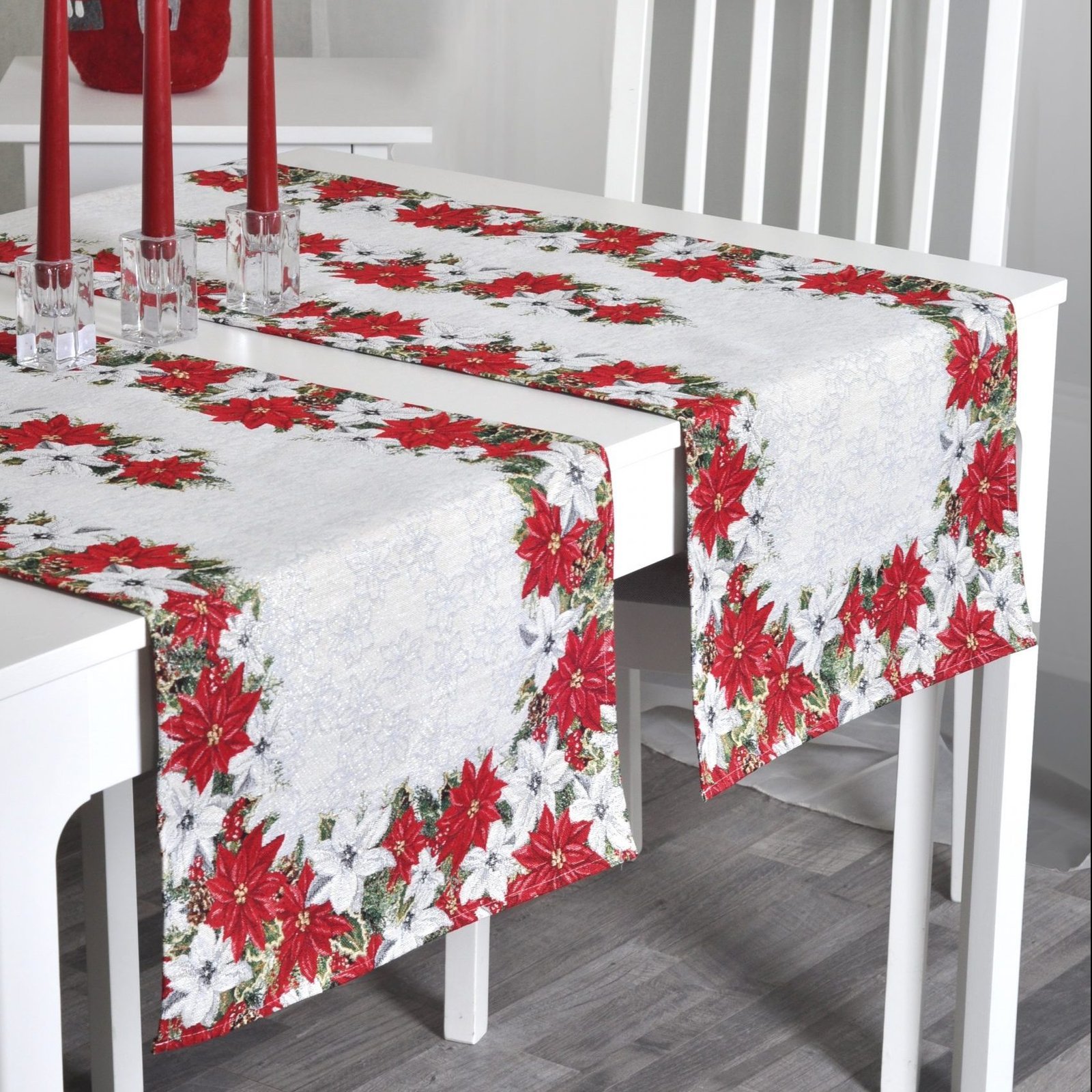 The Christmas table track Poinsettia Assortion is made of tapestries of delicate, beautiful, luxurious and always fashionable. The table tracks decorate the interior, while the solid tapestries protect the table from hot spots, scratches and general deterioration of the table. When you want other, special table decorations, we invite you to purchase a fabric track from tapestries. & nbsp; This table track combines table wipes from the same collection. We invite you to see and choose a set for interior decoration. Table wipes are available here. Care: We recommend cleaning table tracks with dry chemical cleaning. In an automatic washing machine, the fabric can be washed at a temperature not exceeding 30 degrees without the use of bleach and chlorine-containing washing agents. Gobelenic tissue must be naturally dried, it is important not to dry, and cannot be dried in an automatic dryer. & nbsp; Made in the European Union. & nbsp; In reality, the shades of the products may differ slightly from those of the photographs due to different settings of the computer colours, brightness and darkness, contrast settings.