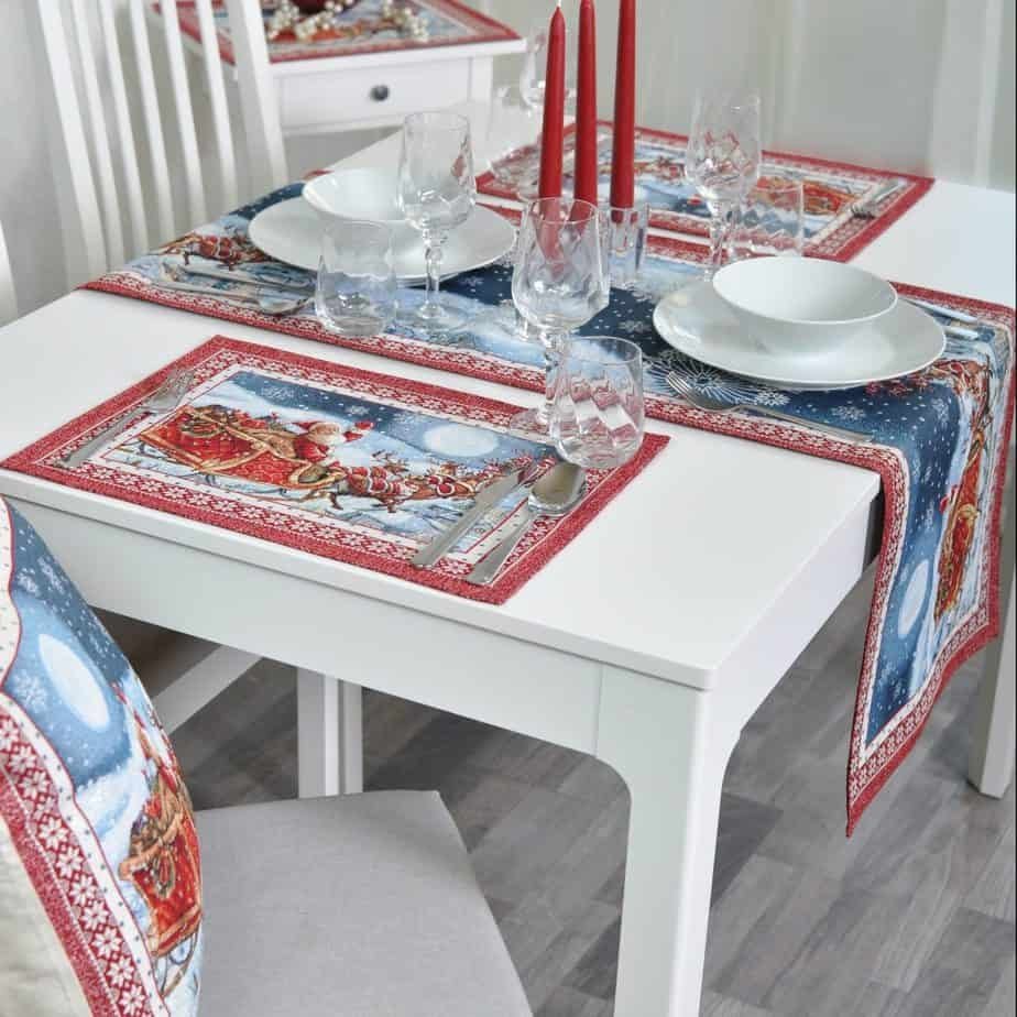Christmas table track Santa in Sleigh is made of tapestries of delicate, decorative, luxurious and always fashionable. The table tracks decorate the interior, while the solid tapestries protect the table from hot spots, scratches and general deterioration of the table. When you want other, special table decorations, we invite you to purchase a fabric track from tapestries. & nbsp; This table track combines table wipes from the same collection. We invite you to see and choose a set for interior decoration. Table wipes are available here. Care: We recommend cleaning table tracks with dry chemical cleaning. In an automatic washing machine, the fabric can be washed at a temperature not exceeding 30 degrees without the use of bleach and chlorine-containing washing agents. Gobelenic tissue must be naturally dried, it is important not to dry, and cannot be dried in an automatic dryer. & nbsp; Made in the European Union. & nbsp; In reality, the shades of the products may differ slightly from those of the photographs due to different settings of the computer colours, brightness and darkness, contrast settings.