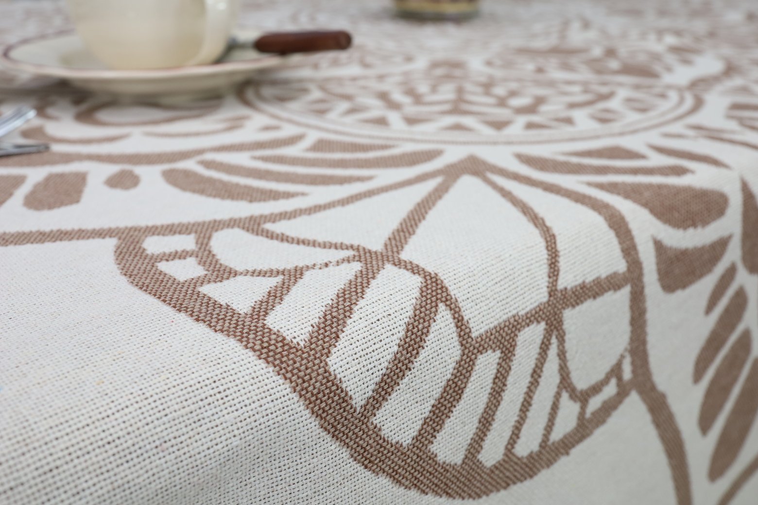 The cotton tablecloth Mandala takes you back to your childhood home. A feeling of coziness, simplicity and warmth envelops you when you look at the products in this line. The natural, calm, earthy colors and time-tested patterns woven into the tablecloths, table runners, table placemats, and aprons fit perfectly into everyday, practical interiors and decorate summerhouse spaces.