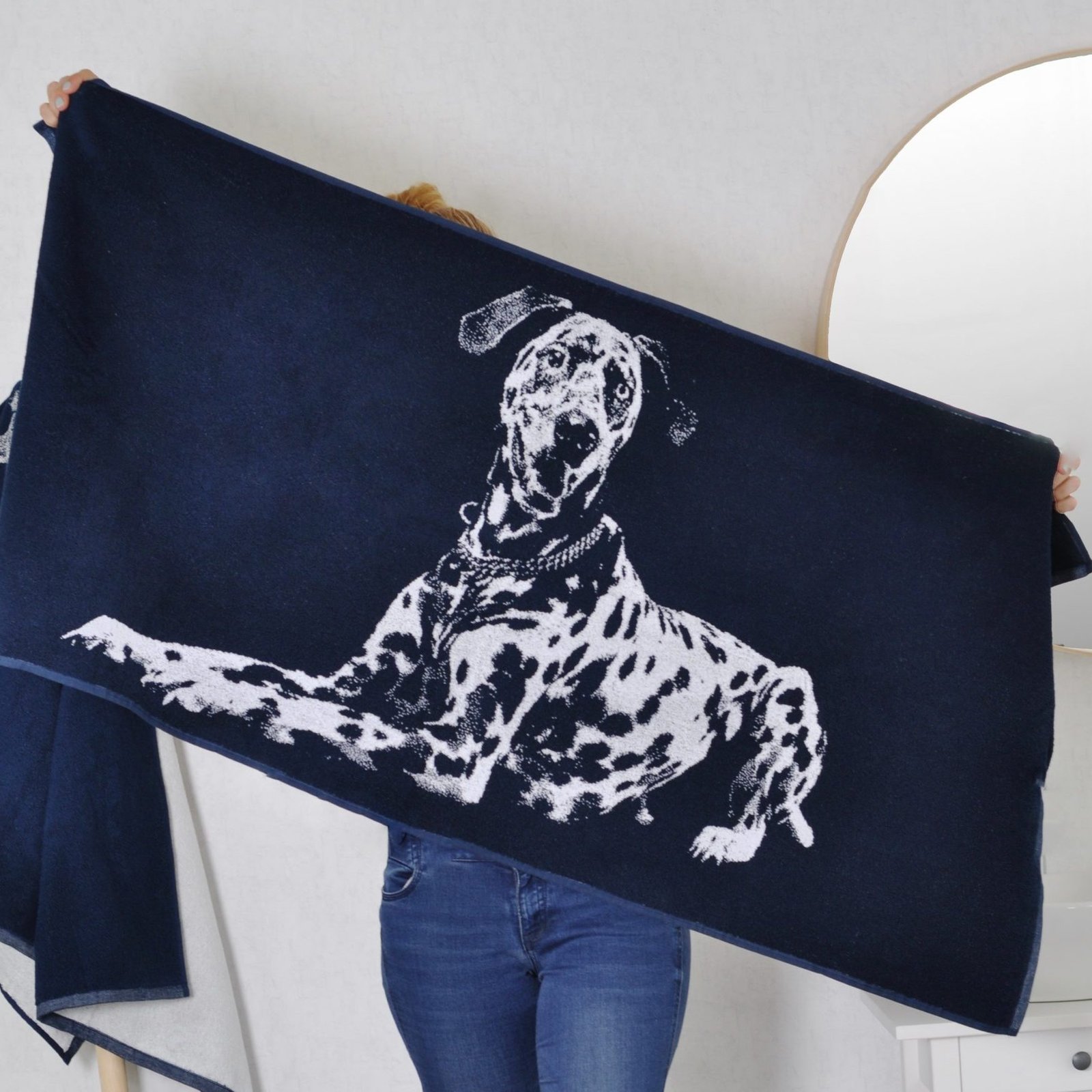 Cotton towel Dalmatian is a great gift for every dog lover. These towels are natural and made of high quality materials. Care: We recommend washing towels in an automatic washing machine at a temperature not exceeding 40 degrees without the use of bleach and chlorine-containing washing agents. We advise to avoid softeners, especially those containing silicone, because the latter is injected into the fabric, towels do not absorb moisture so well. The towels can be dried in an automatic dryer at low temperatures. In the case of outdoor drying, direct sunlight should be avoided, as sunlight will eventually decay even the highest quality fabric. When comparing the towel, the maximum ironing temperature can be 150 ° С. Cotton towels are not recommended for dry cleaning. Made in Europe. More bath towels for dogs will find where. You will find all the towels where.