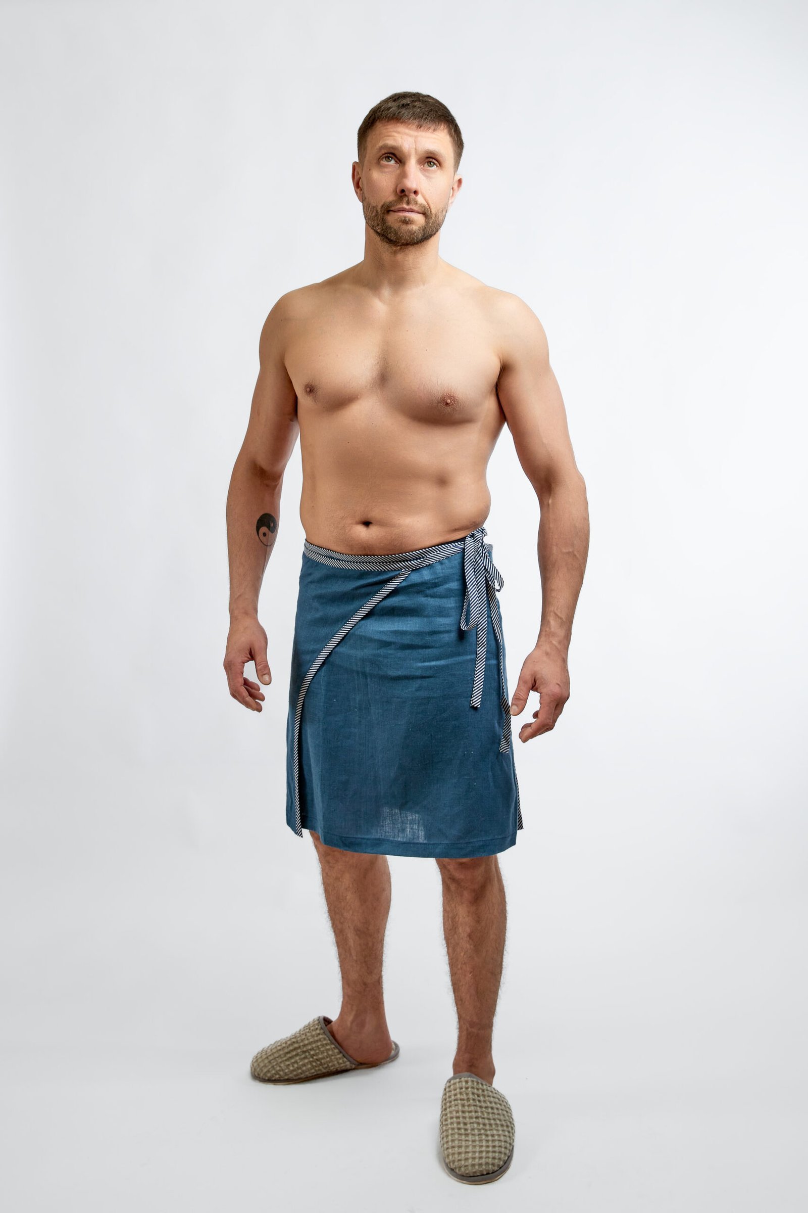 The male apron (blue) of the famous flax – for him, who likes sauna, naturality and comfort. The girdle ties in. The length of the apron to several saunas is designed to maximize the combination of useful tissue properties and ease of wear. This sauna apron: