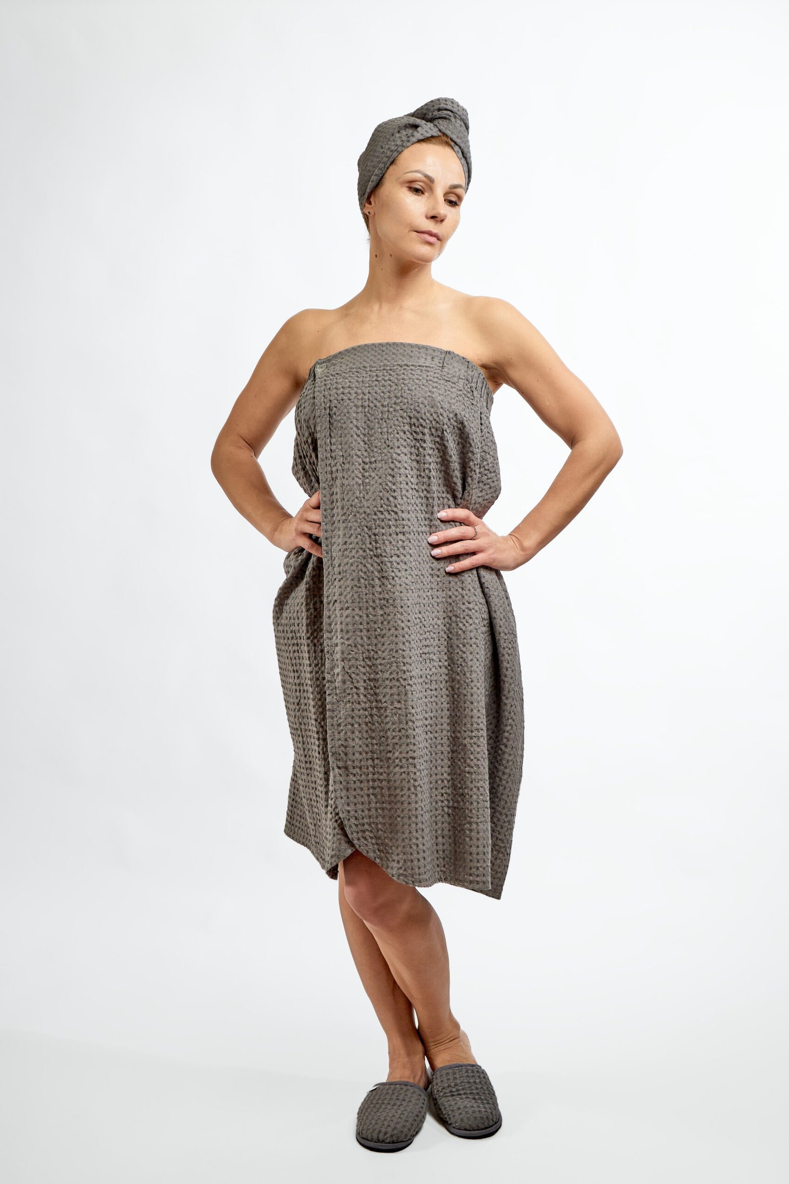 Graphite Colors Waffle for cotton and linen fabric She likes sauna, naturality and comfort. Stitched at the chest with wider rubber, adjusting the width, length to several bath aprons are designed to maximize the harmonisation of the beneficial properties of the fabric and ease of wear. This sauna apron: