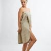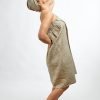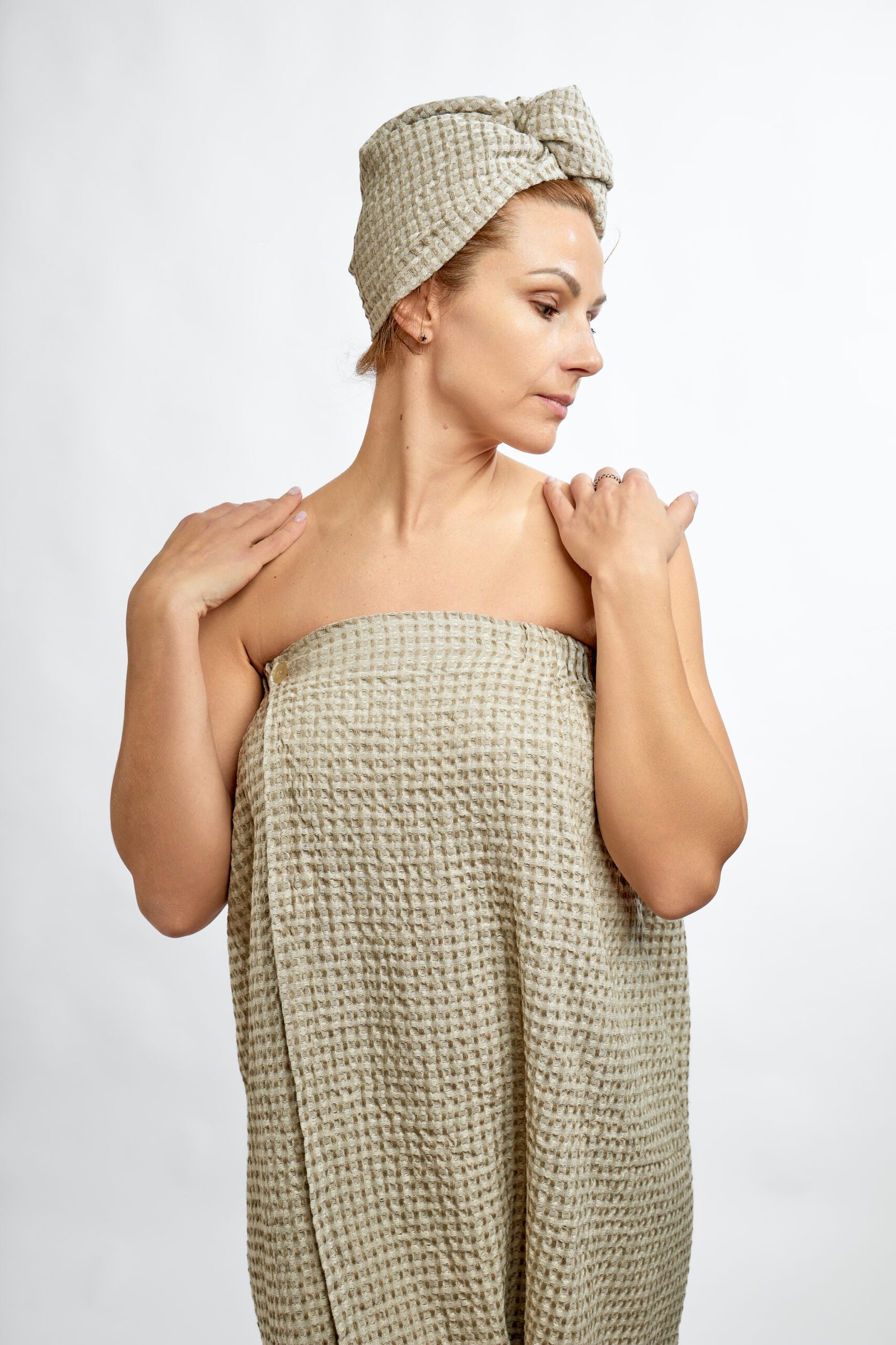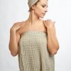 Grey waffle cotton and linen fabric female sauna apron She likes sauna, naturality and comfort. Stitched at the chest with wider rubber, adjusting the width, length to several bath aprons are designed to maximize the harmonisation of the beneficial properties of the fabric and ease of wear. This sauna apron: