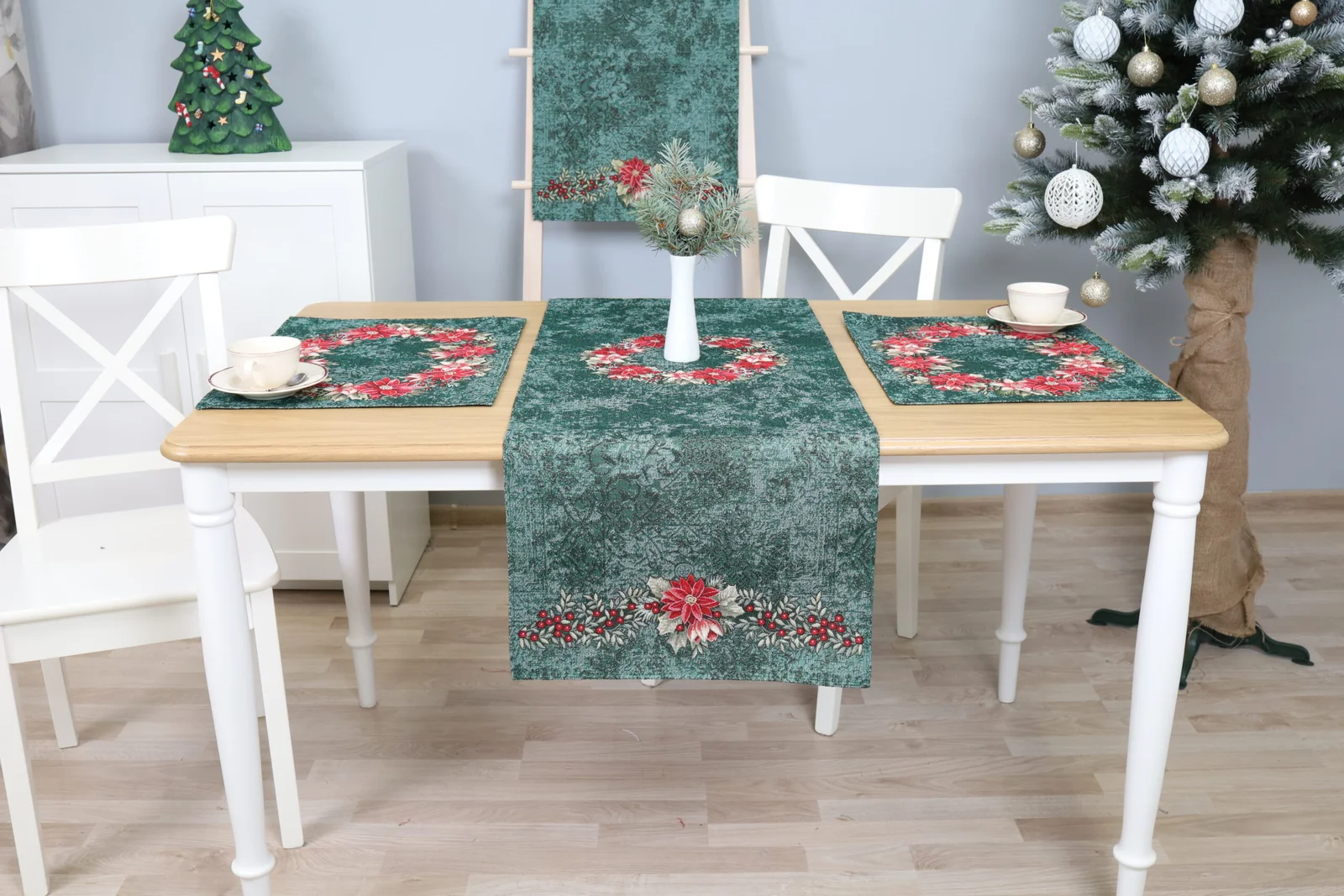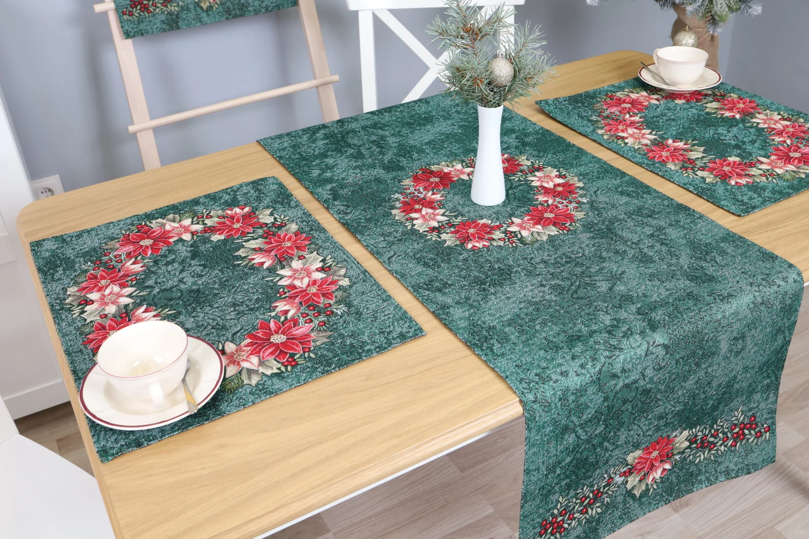 Green Christmas Table Runner Poinsettia Wreath