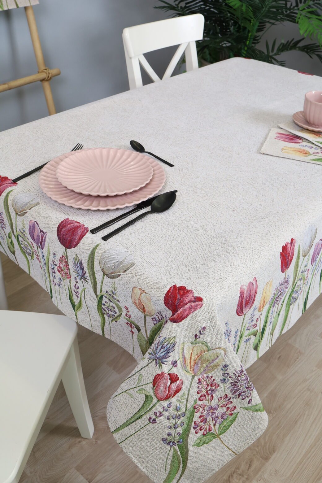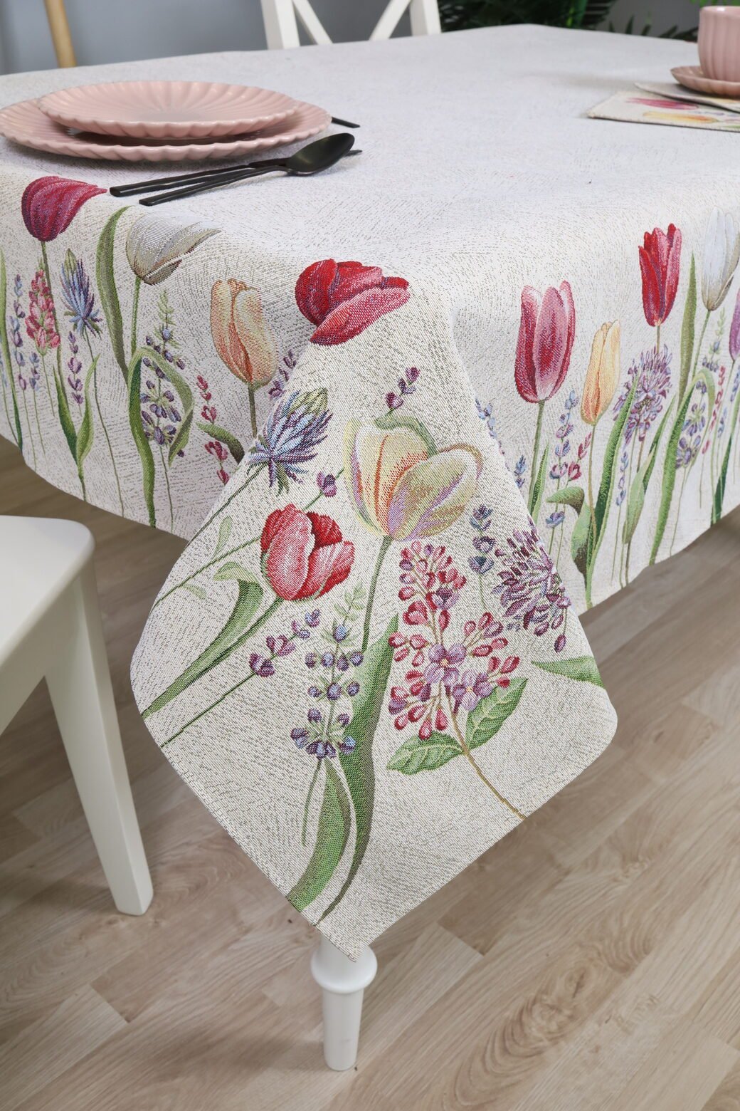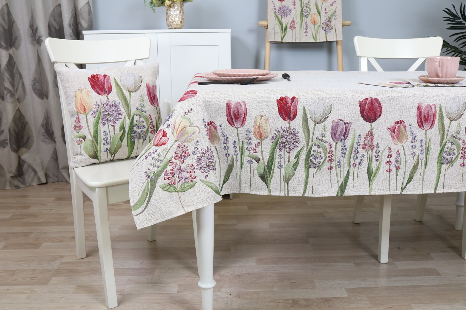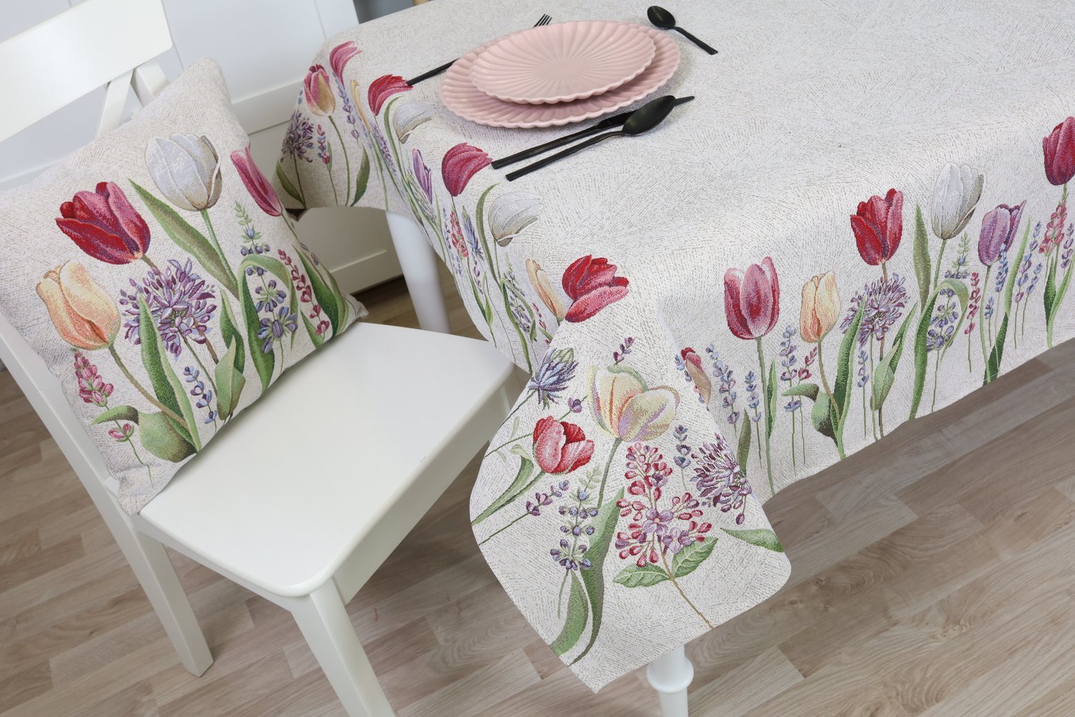 A luxurious, elegant jacquard tablecloth Tulips is made of sturdy tapestry fabric. It is a high-quality, subtle, and memorable gift.