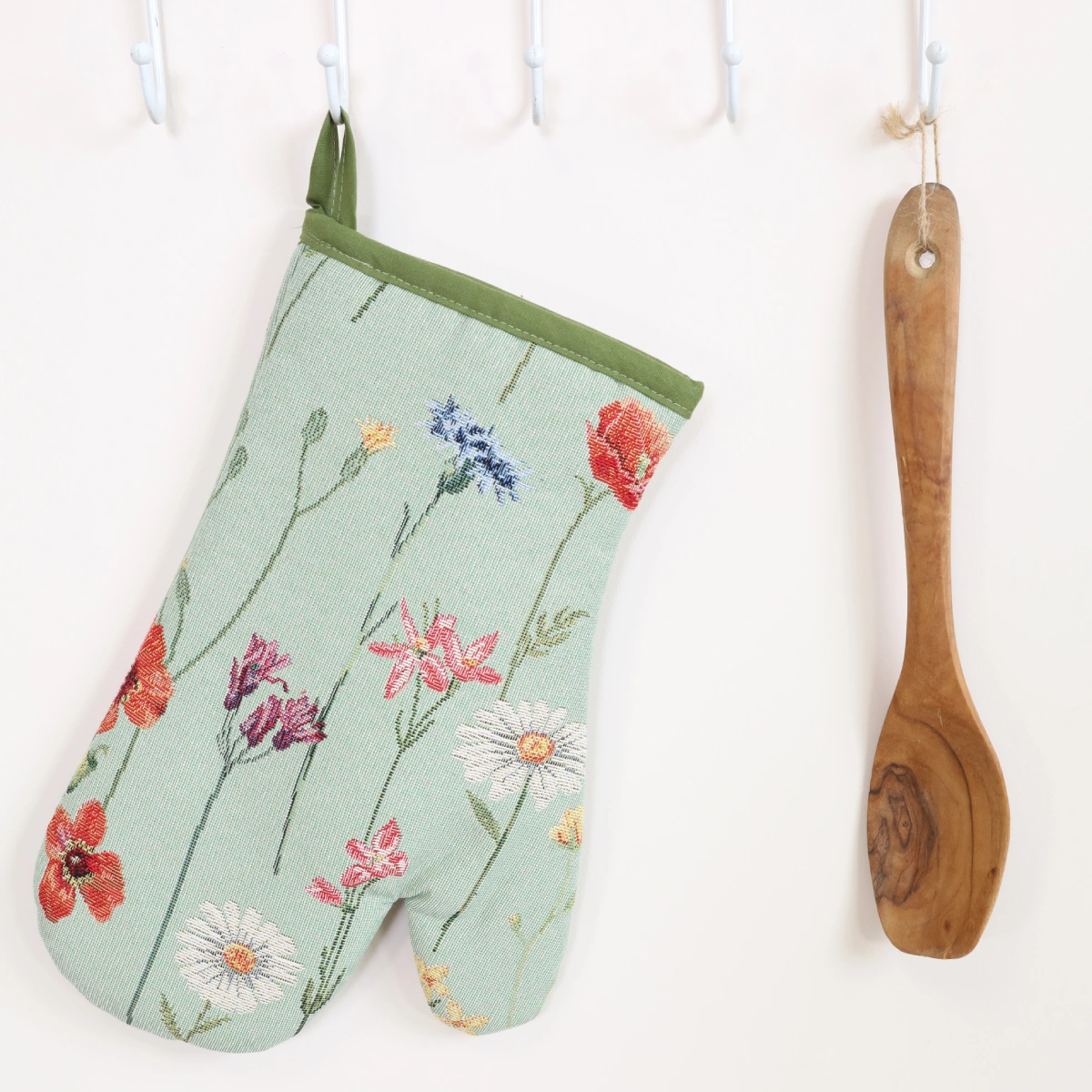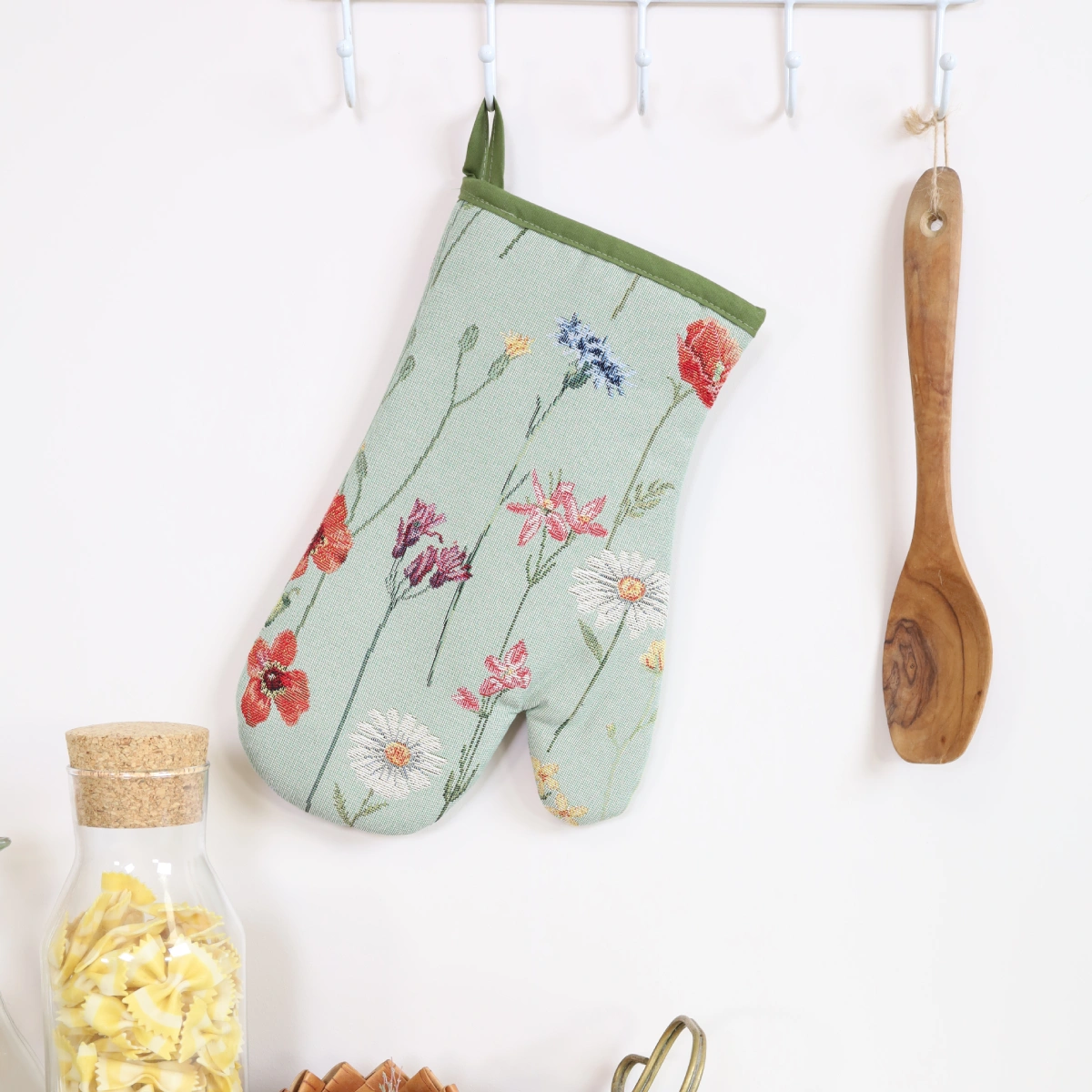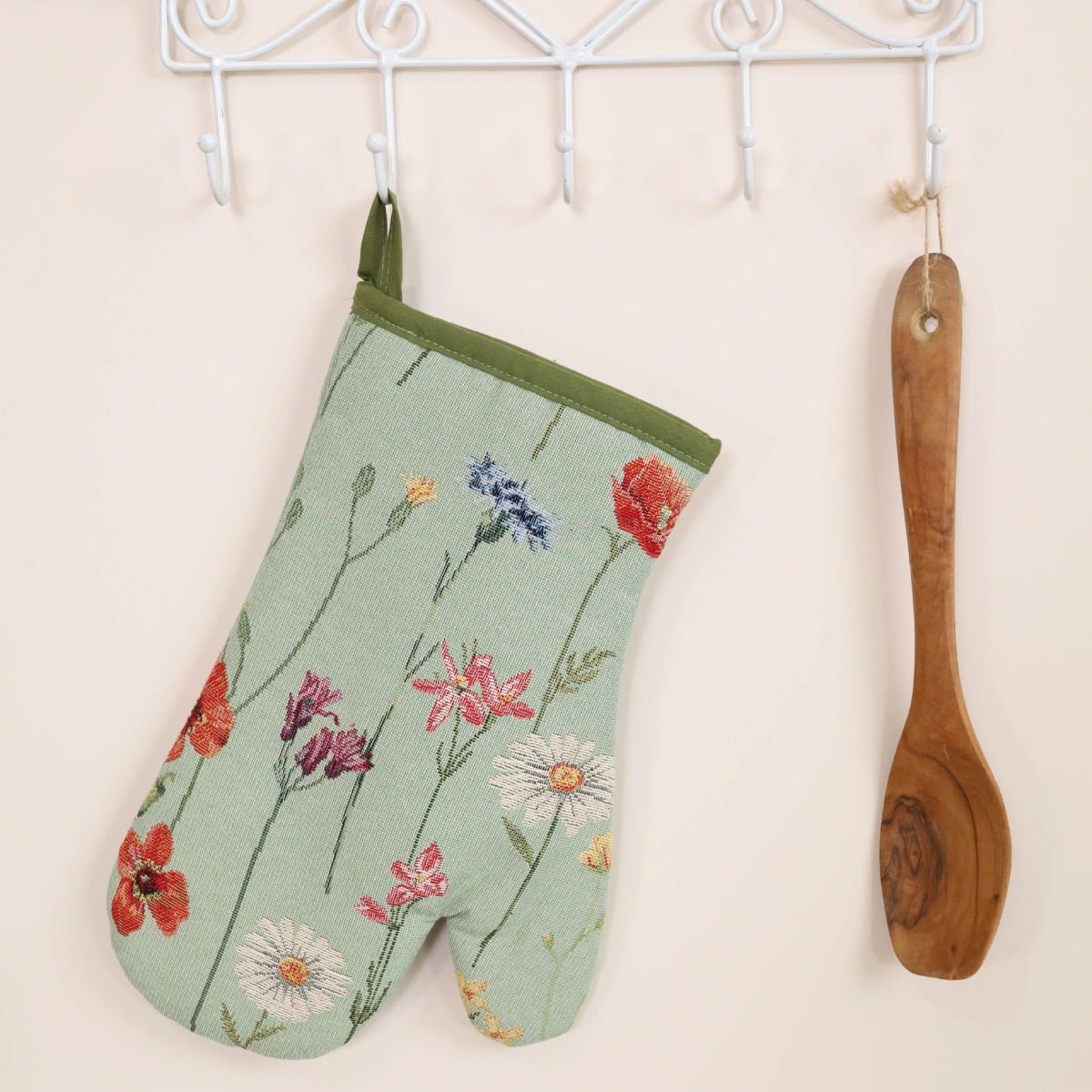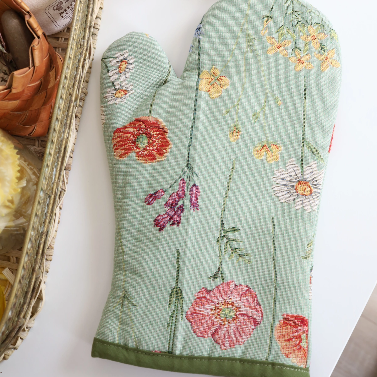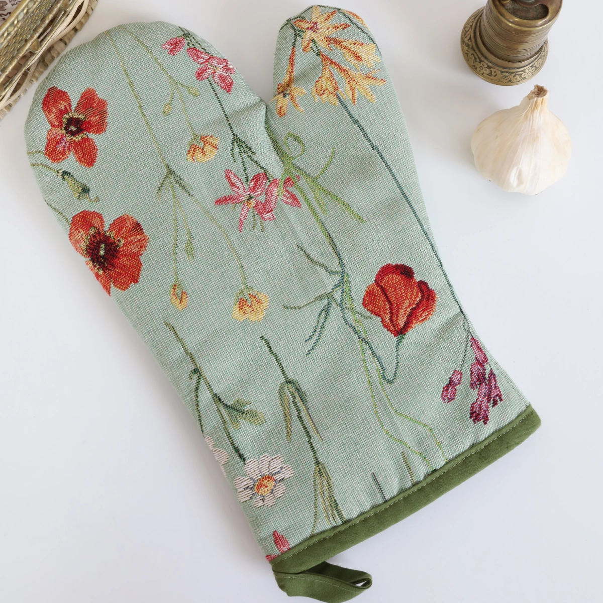 A kitchen glove from a woven tapestry material. Fabric: Cotton 45%, Polyester 35%, Acryl 20%