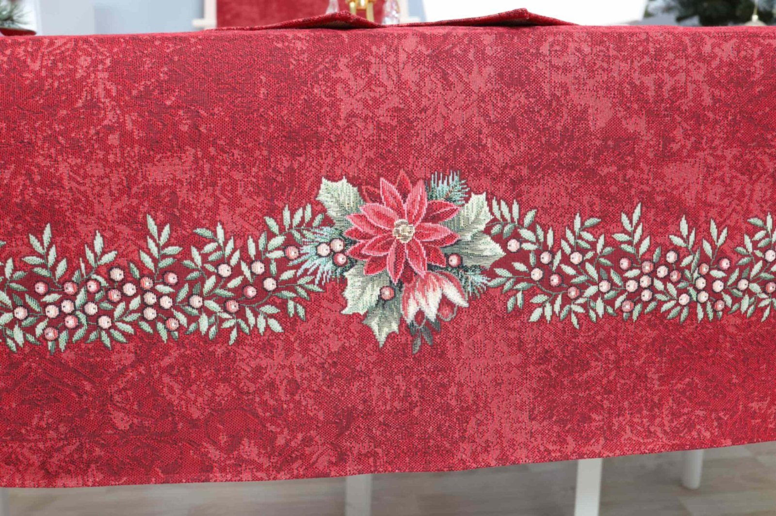Decorative, elegant, solid tapestries red Christmas table Poinsettia Wreath, decorated with Christmas flower grounds. This is a wonderful, delicate and memorable Christmas present. This table is accompanied by table wipes, table tracks and decorative pillows from the same collection. We invite you to look at other items of this collection and choose a set to decorate the interior of the house according to your needs. You will find Christmas table napkins whereThe table tracks of different sizes are in this shelves, o decorative pillow covers where. Care: Red Christmas table Poinsettia Wreath is recommended for dry chemical cleaning. In an automatic washing machine, the fabric can be washed at a temperature not exceeding 30 degrees without the use of bleach and chlorine-containing washing agents. Gobelenic tissue must be naturally dried, it is important not to dry, and cannot be dried in an automatic dryer. It is recommended to compare not more than 110 degrees. Made in the European Union. In reality, the shades of the products may differ slightly from those of the photographs due to different settings of the computer colours, brightness and darkness, contrast settings.