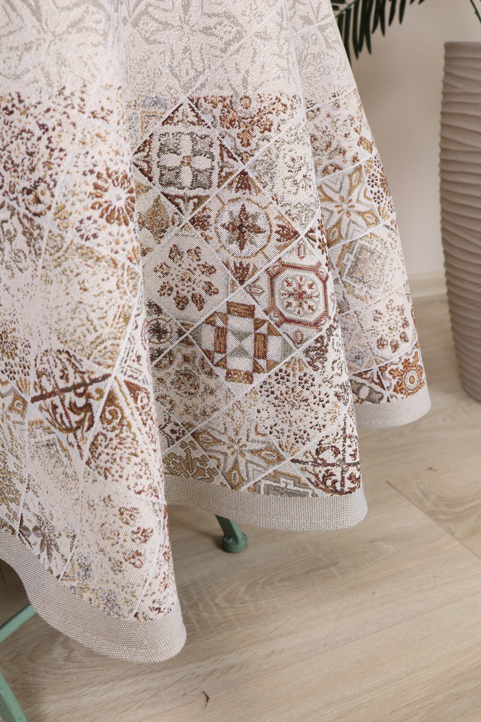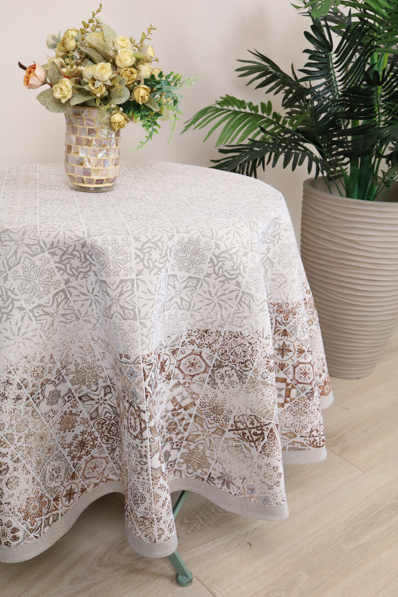 Care: We recommend dry cleaning tablecloths. The fabric can be washed at a temperature no higher than 30°C, without bleach or chlorine-based detergents. Tapestry fabric must be dried naturally because it is important not to over-dry them, and they should not be dried in an automatic dryer. We recommend ironing at a temperature of no more than 110°C.