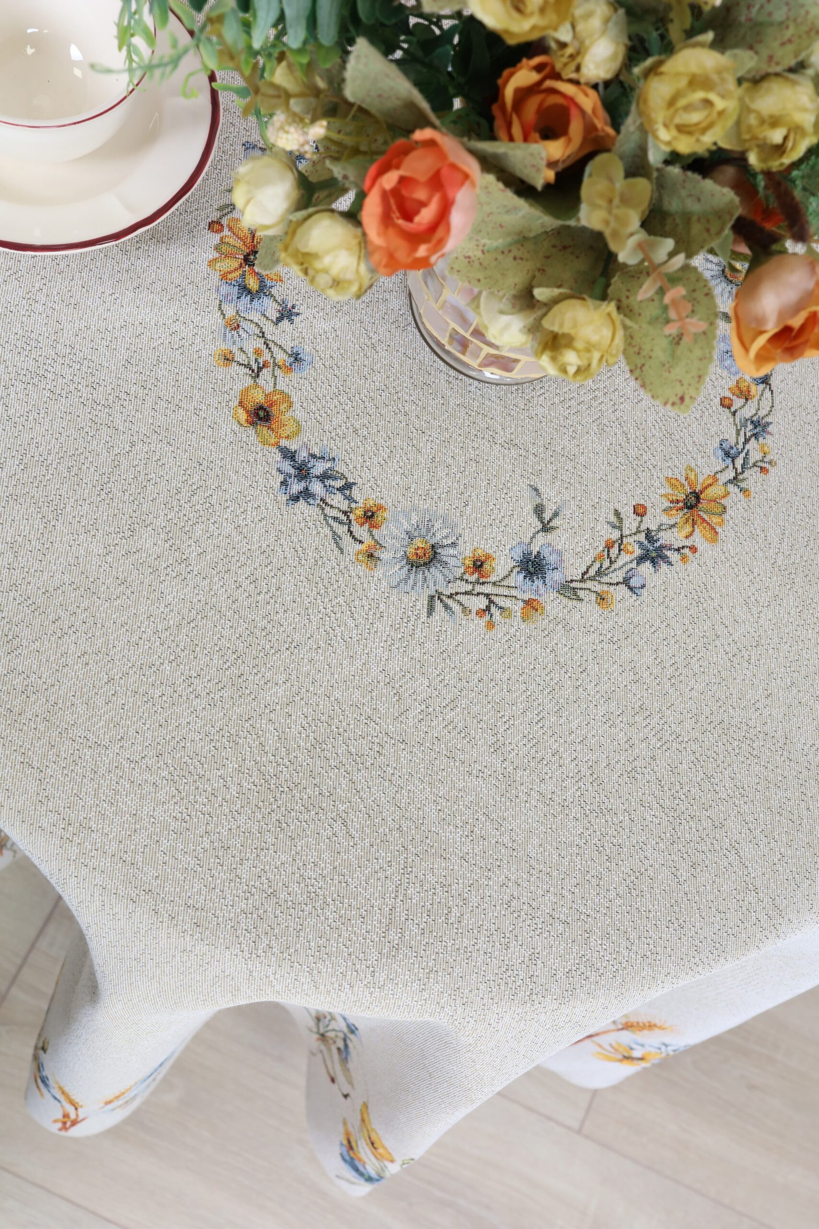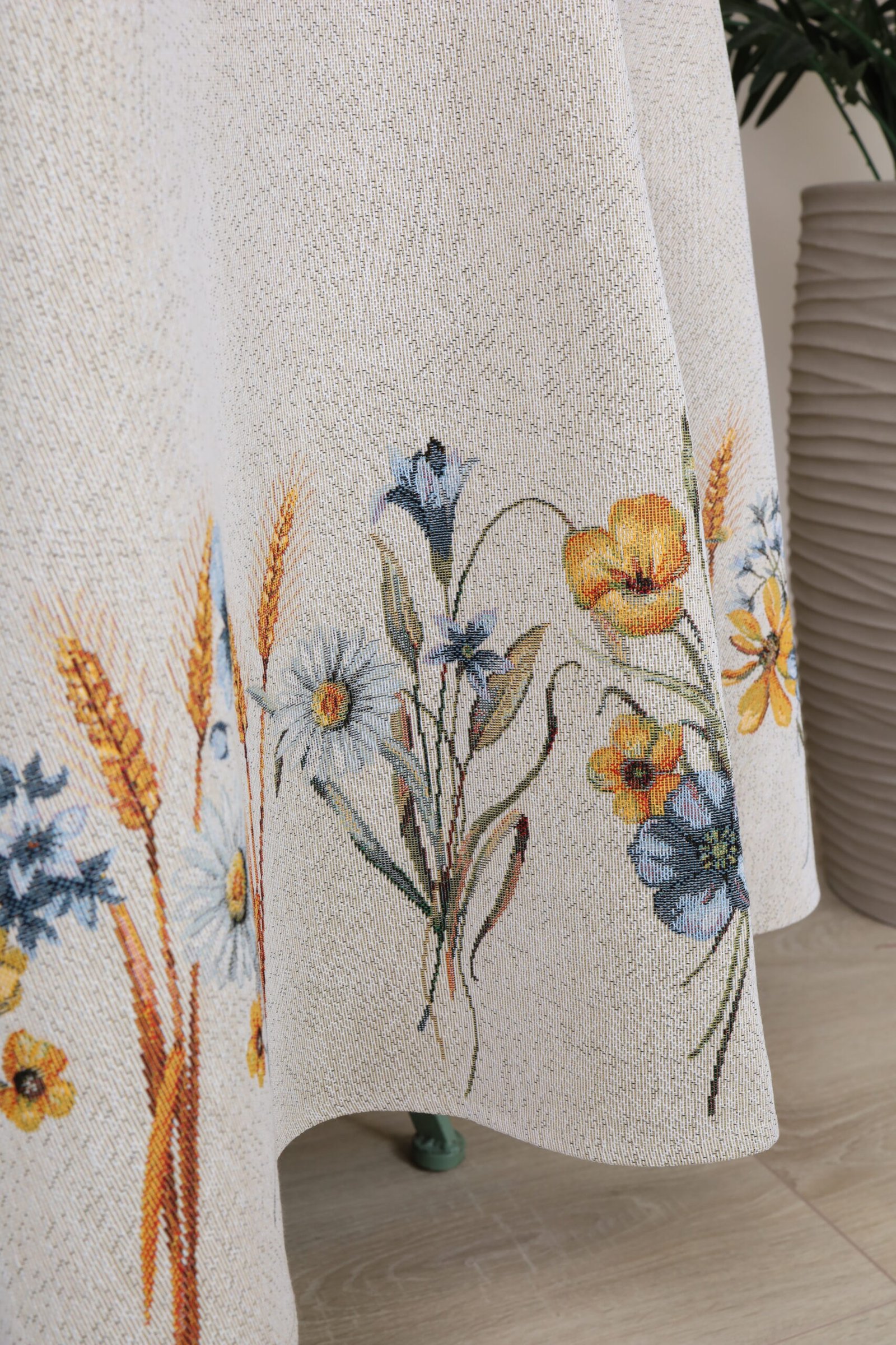 Care: We recommend dry cleaning tablecloths. The fabric can be washed at a temperature no higher than 30°C, without bleach or chlorine-based detergents. Tapestry fabric must be dried naturally because it is important not to over-dry them, and they should not be dried in an automatic dryer. We recommend ironing at a temperature of no more than 110°C.