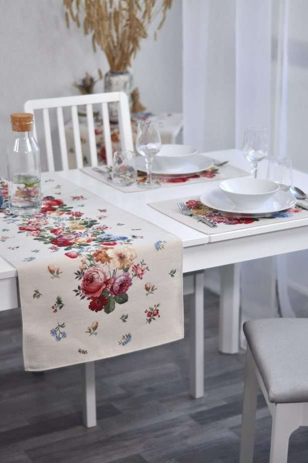 Table runner Flower assortment is woven tapestry fabric – subtle, decorative, luxurious, and always fashionable. Beautifully woven fabric table runners decorate the interior, while the durable tapestry fabric protects the table from “hot” stains, scratches, and general wear and tear. When you want different, unique table decorations, we invite you to purchase this fabric table runner made of tapestry fabric.