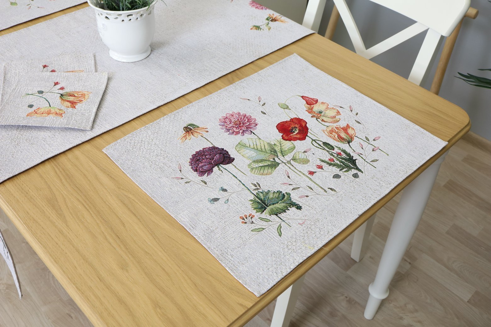 This tapestry table runner with its unique design will brighten up your home interior and give your table a distinctive look. The sturdy, woven tapestry is characterized by its high quality and durability, making it an excellent choice for both everyday use and special occasions. You can match this runner with table placemats from the same collection. You can find the table placemats here.