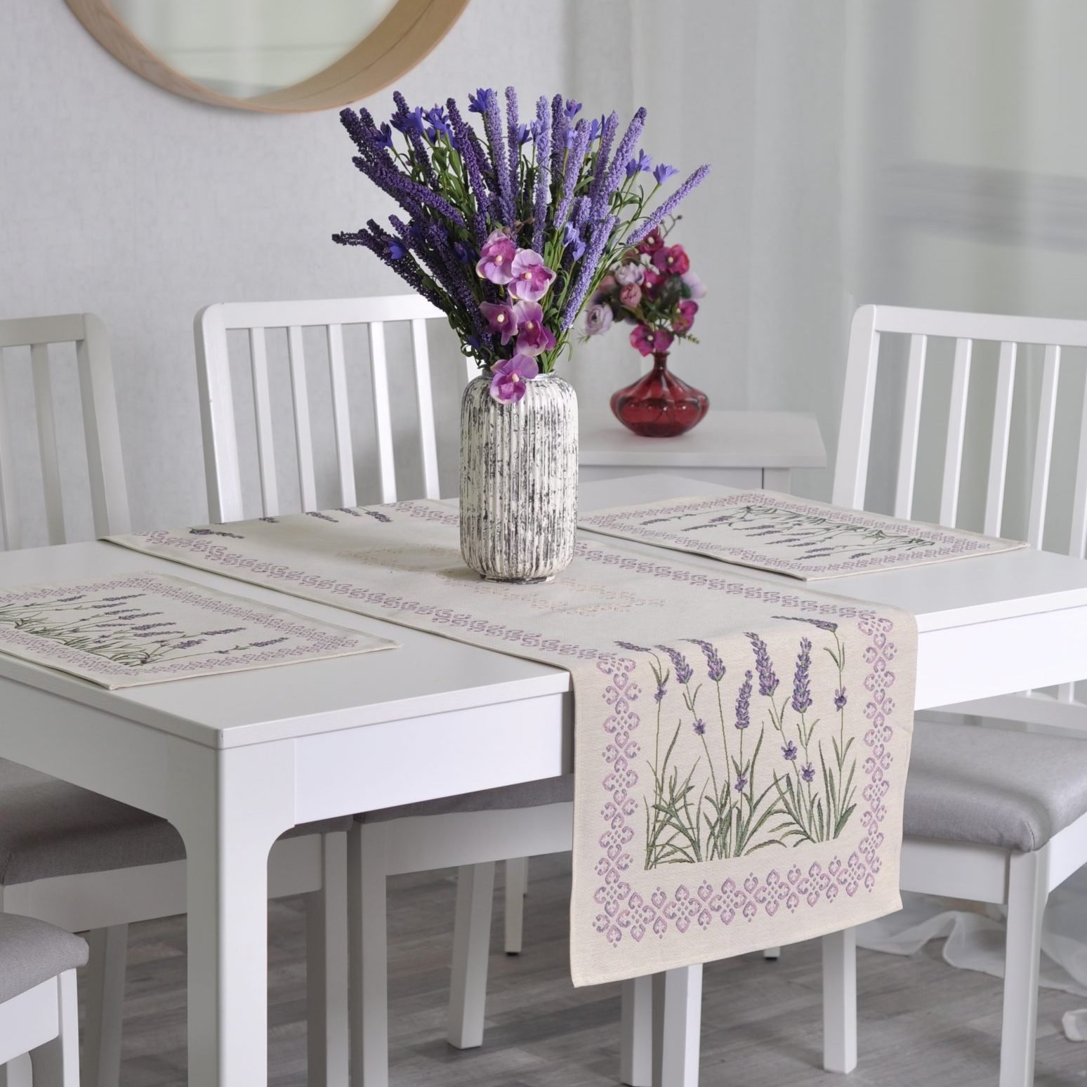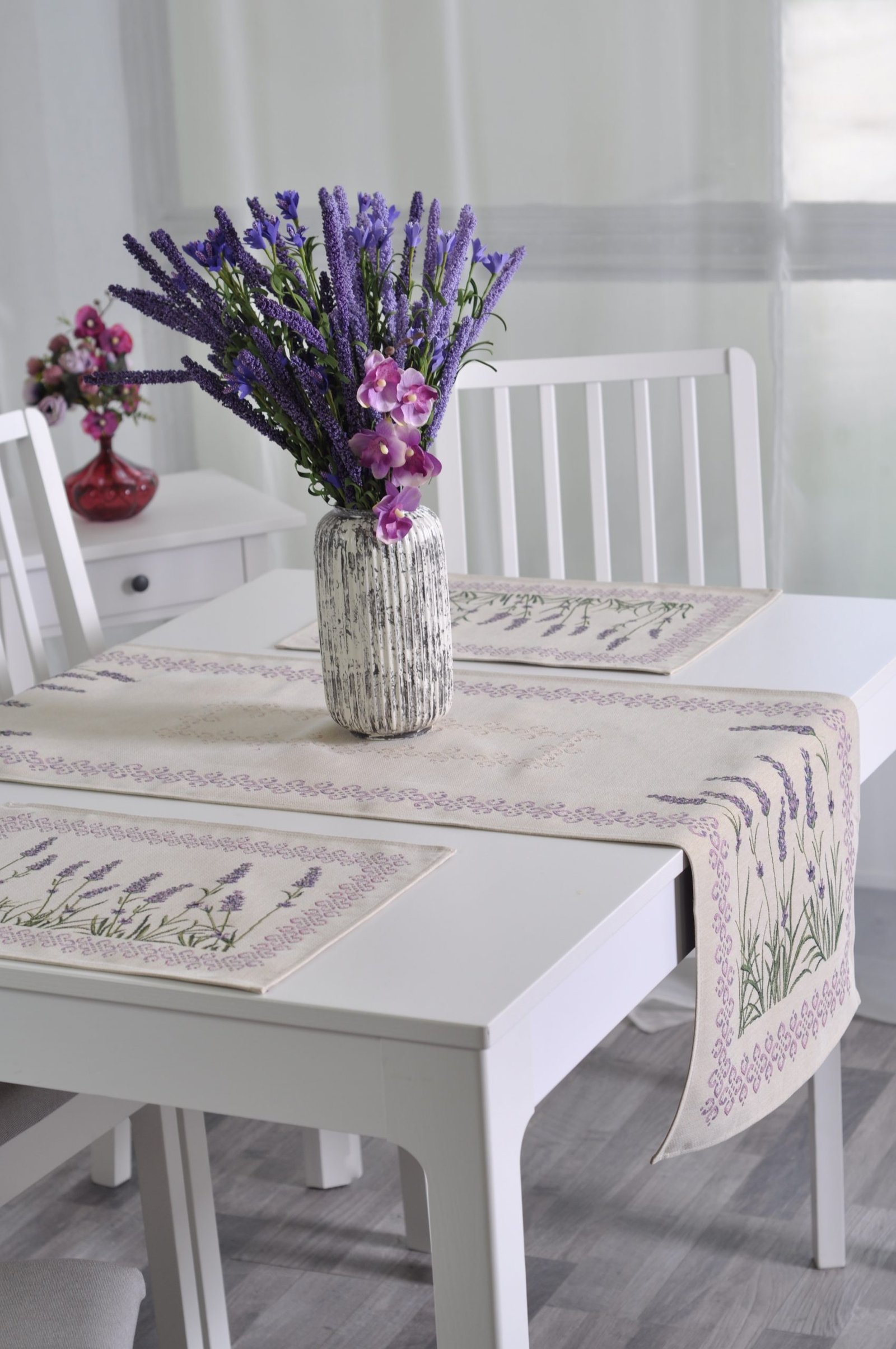 Table runner Lavender meadow is made from tapestry fabric – subtle, decorative, luxurious, and always fashionable. Beautifully woven fabric table runners decorate the interior, while the durable tapestry fabric protects the table from “hot” stains, scratches, and general wear and tear. When you want different, unique table decorations, we invite you to purchase this fabric table runner made of tapestry fabric.