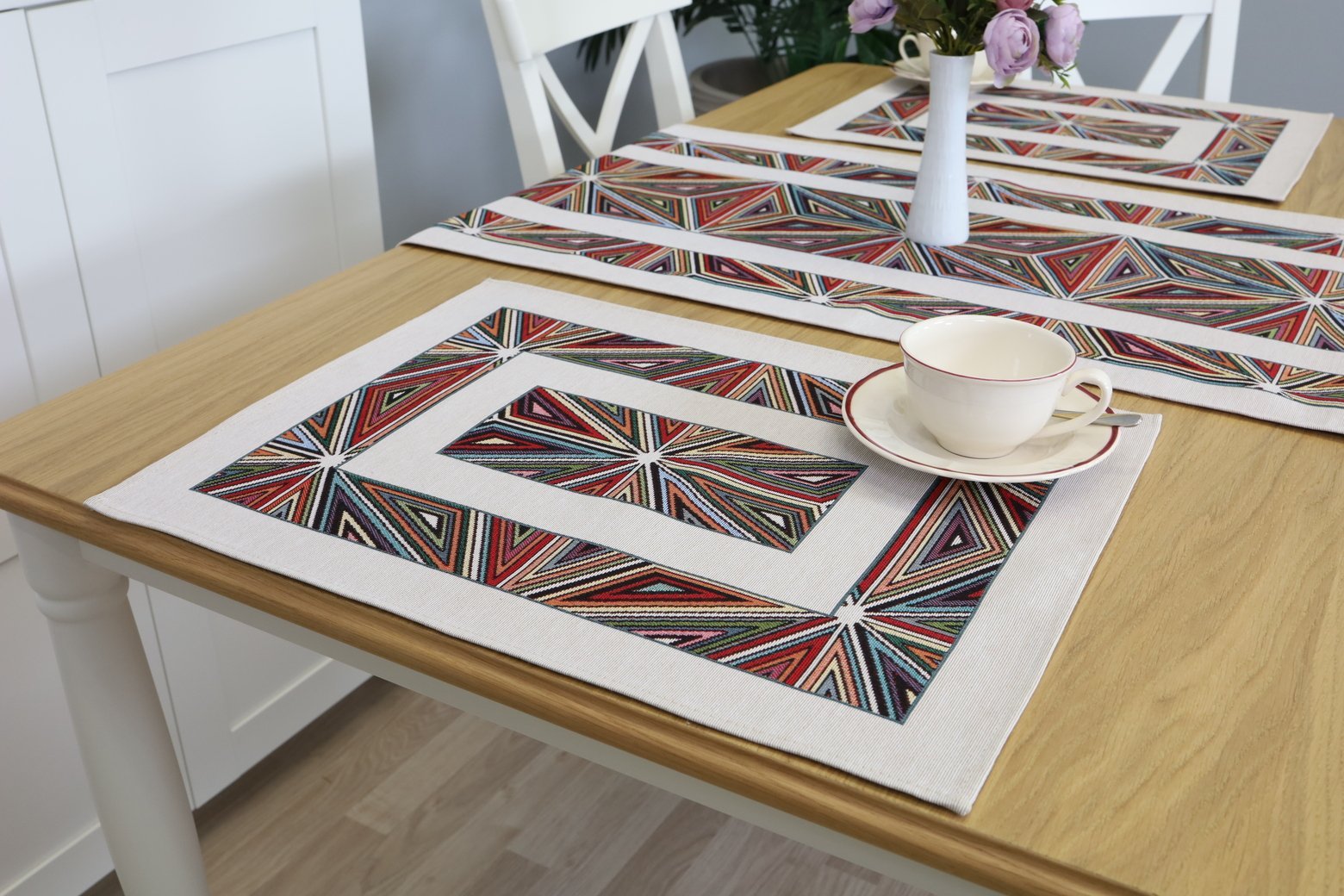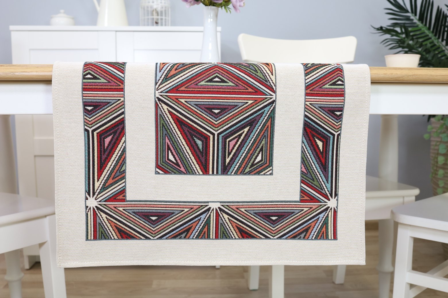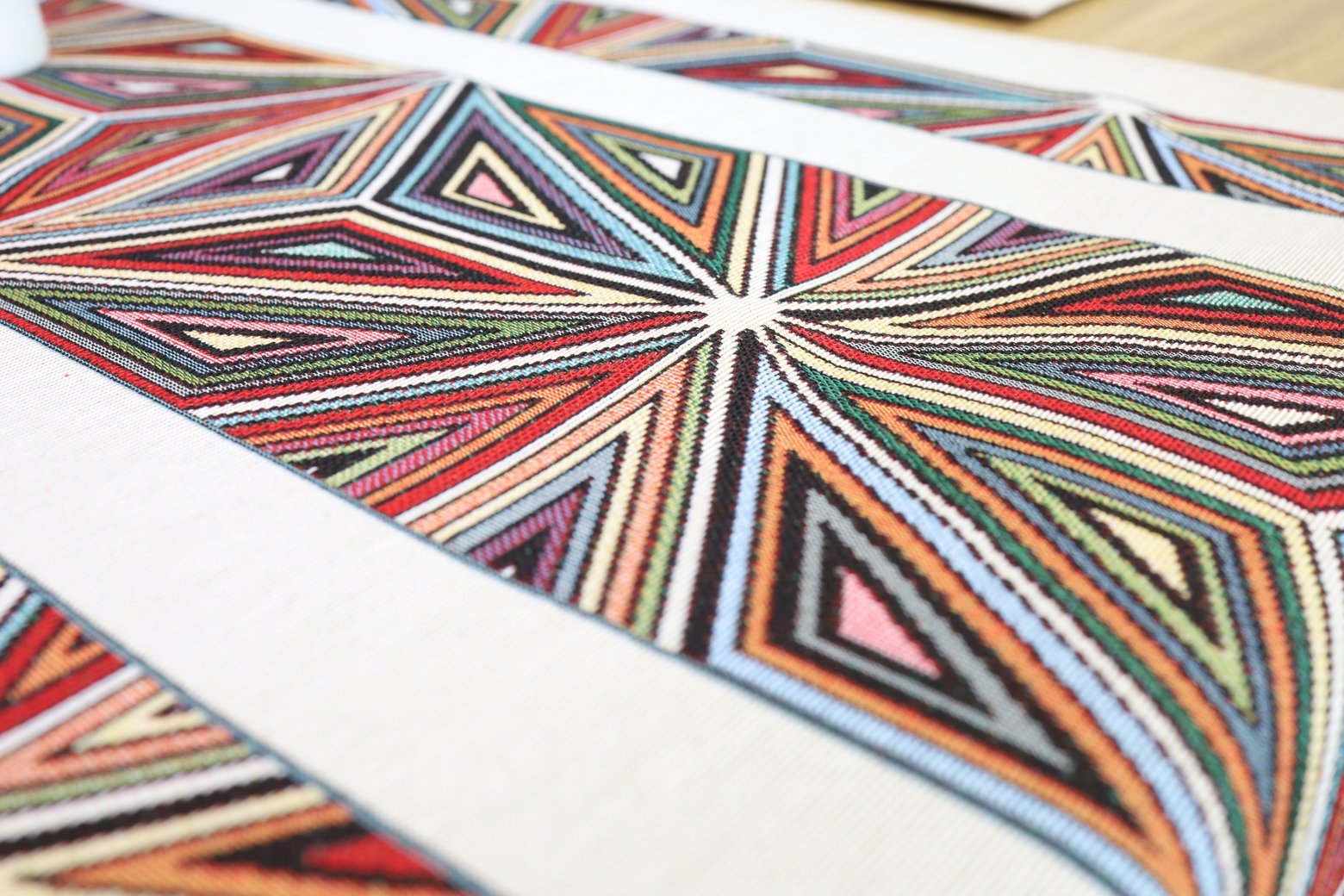 Table runner Mosaic is made from tapestry fabric – subtle, decorative, luxurious, and always fashionable. Beautifully woven fabric table runners decorate the interior, while the durable tapestry fabric protects the table from “hot” stains, scratches, and general wear and tear. When you want different, unique table decorations, we invite you to purchase this fabric table runner made of tapestry fabric.