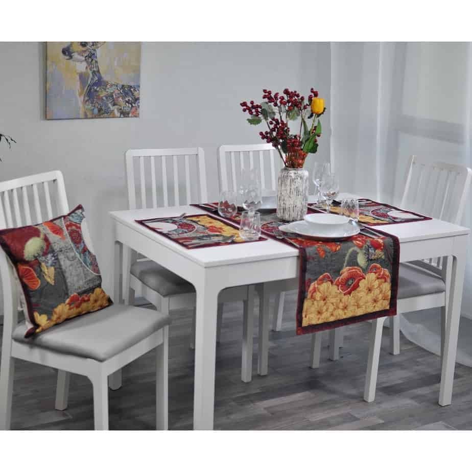 Table runner Poppies is made from tapestry fabric – subtle, decorative, luxurious, and always fashionable. Beautifully woven fabric table runners decorate the interior, while the durable tapestry fabric protects the table from “hot” stains, scratches, and general wear and tear. When you want different, unique table decorations, we invite you to purchase this fabric table runner made of tapestry fabric.