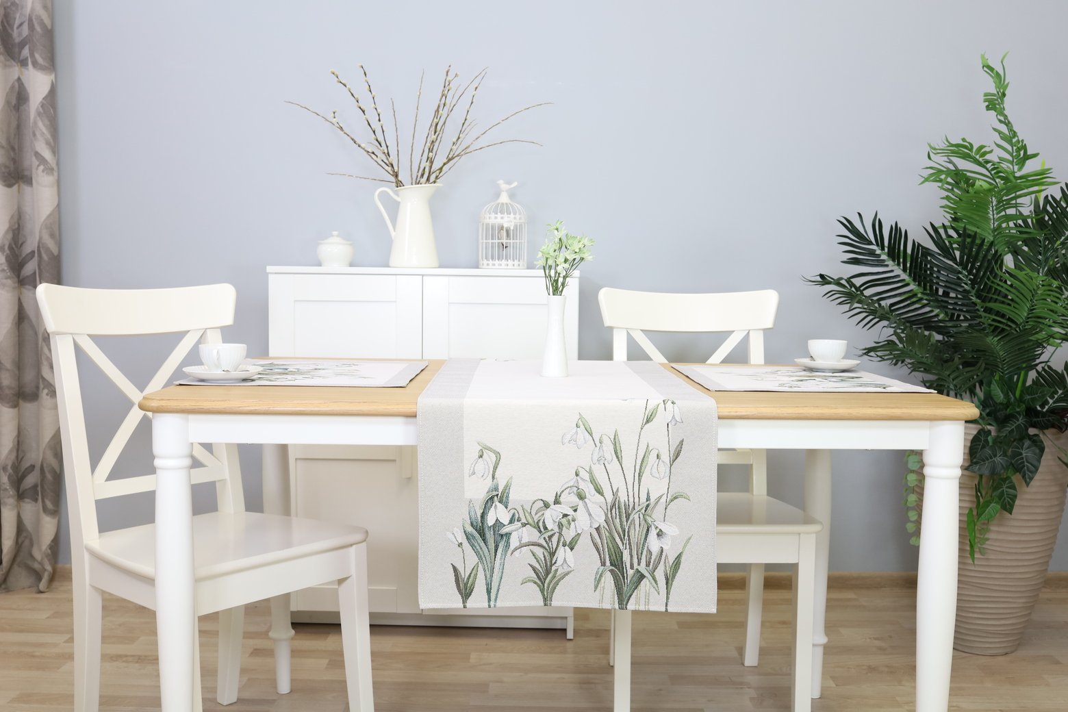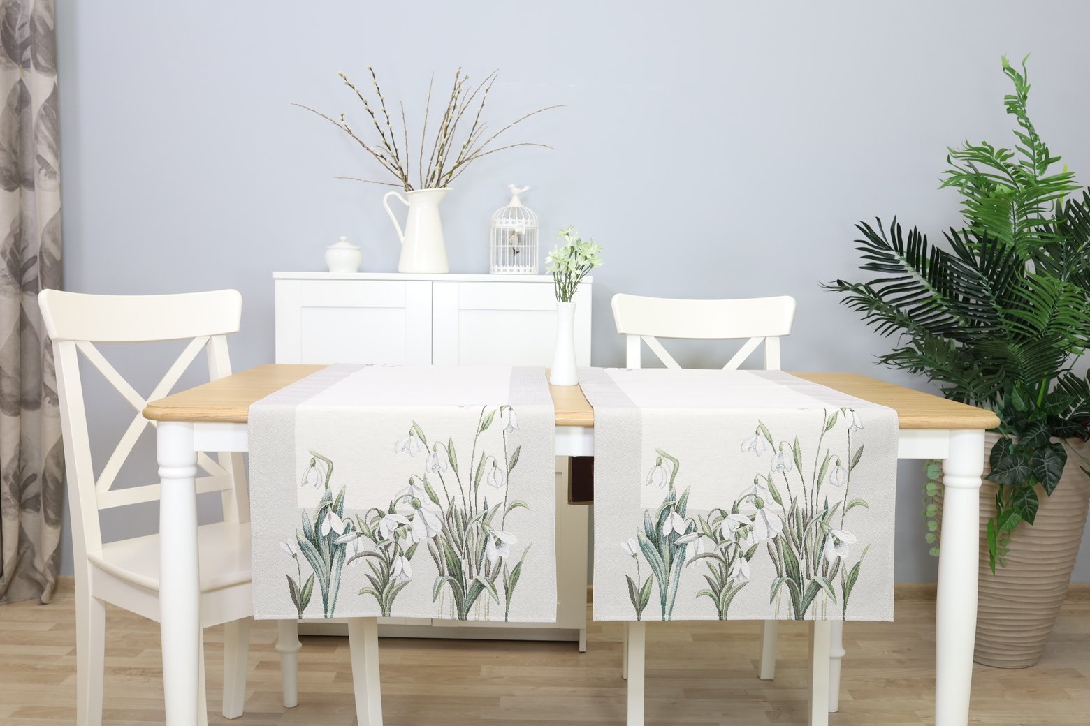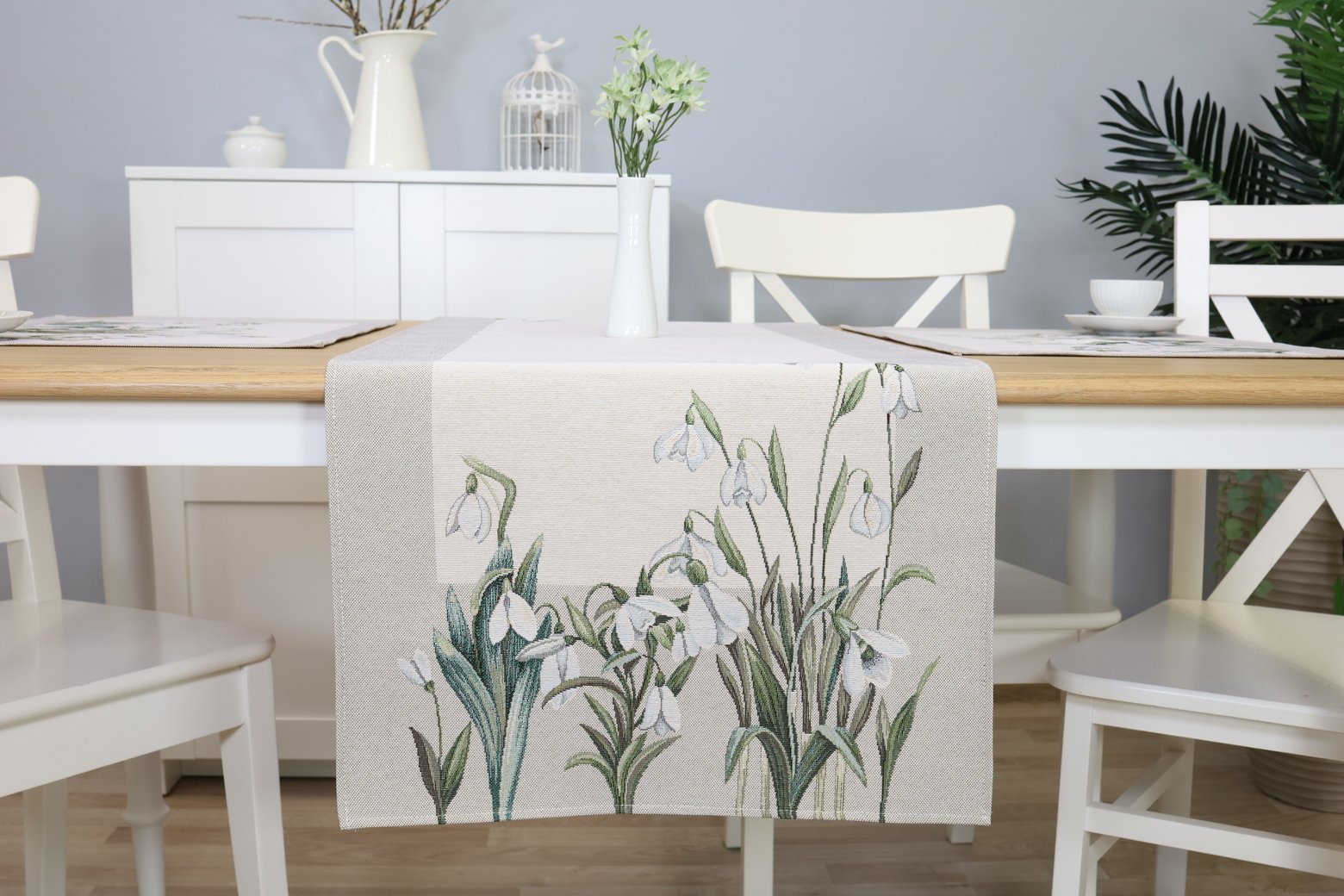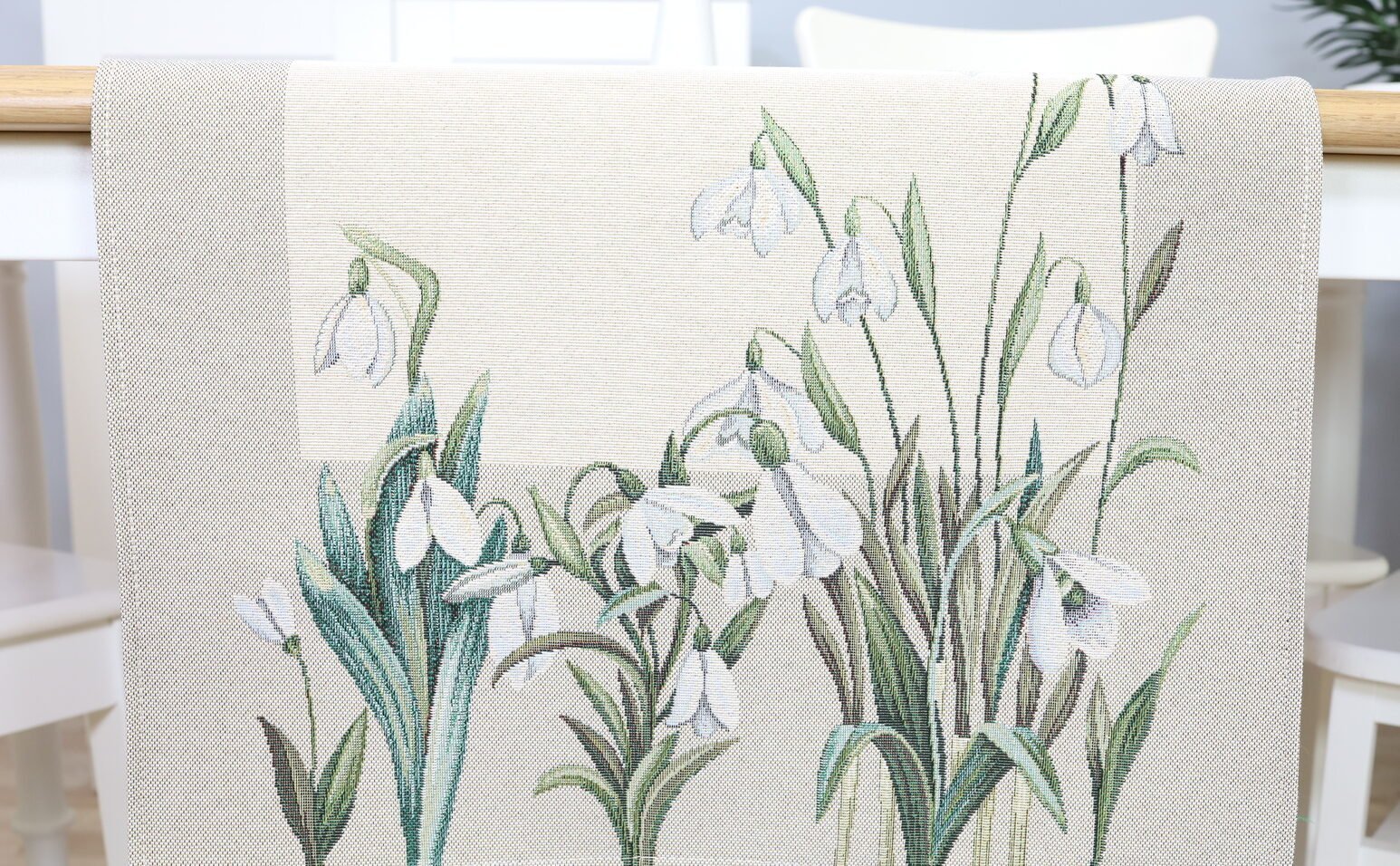 Table runner Snowdrops is made from tapestry fabric – subtle, decorative, luxurious, and always fashionable. Beautifully woven fabric table runners decorate the interior, while the durable tapestry fabric protects the table from “hot” stains, scratches, and general wear and tear. When you want different, unique table decorations, we invite you to purchase this fabric table runner made of tapestry fabric.