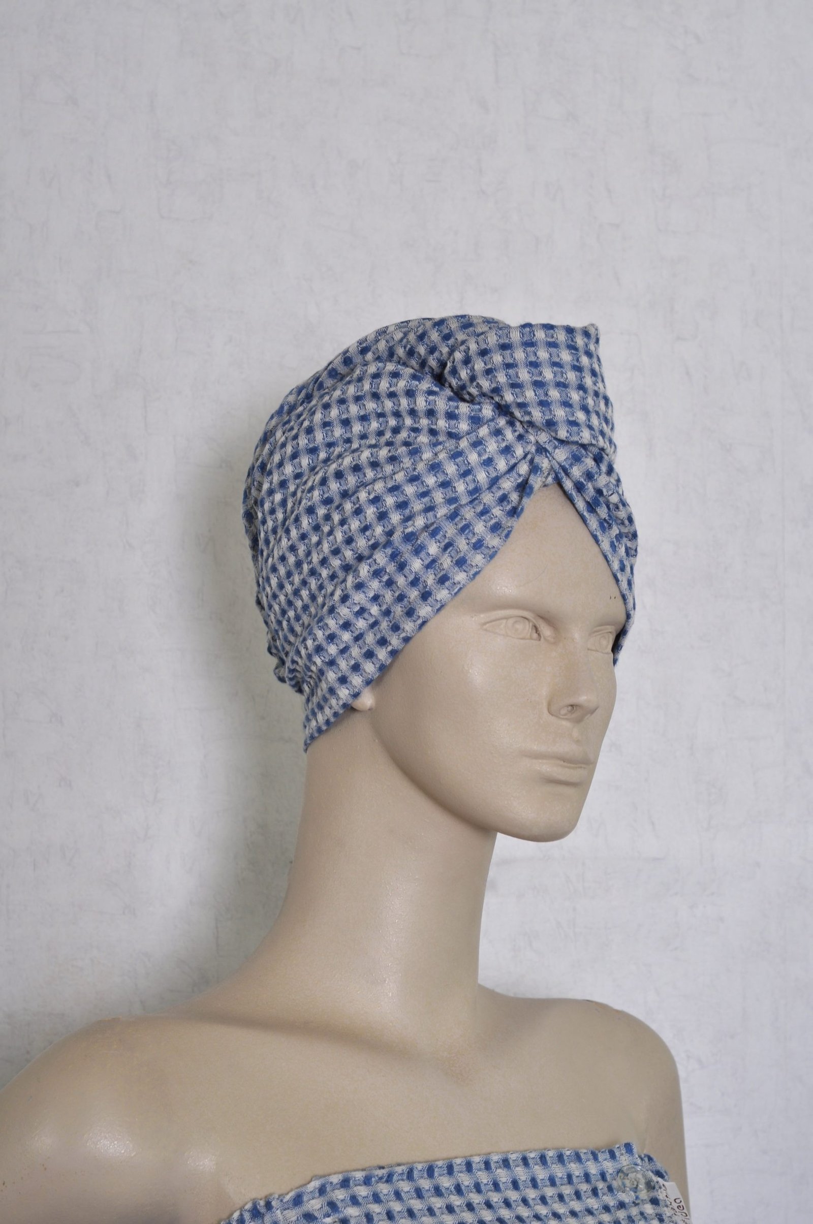 Of waffle blue Colors of linen and cotton fabric made of a towel on the head, also called turban, perform two functions: absorbs the moisture of the hair after head swelling, without damaging the hair, as well as comfortable for use in the sauna as a sauna Hat (especially for long hair whose protection of traditional Sauna Hats is usually too small). This functional head towel does not electrical and does not cause allergies, has antiseptic properties, and the universal, sagute adjustable size makes it comfortable to clog the head and does not slip from it. Two types of head towel can be used:
