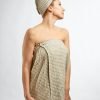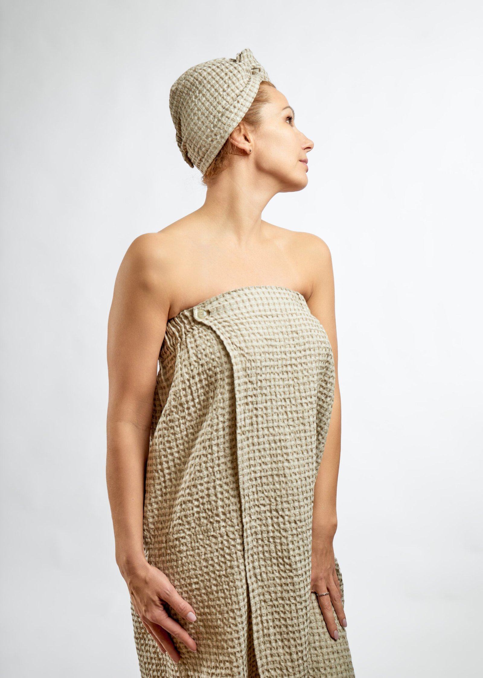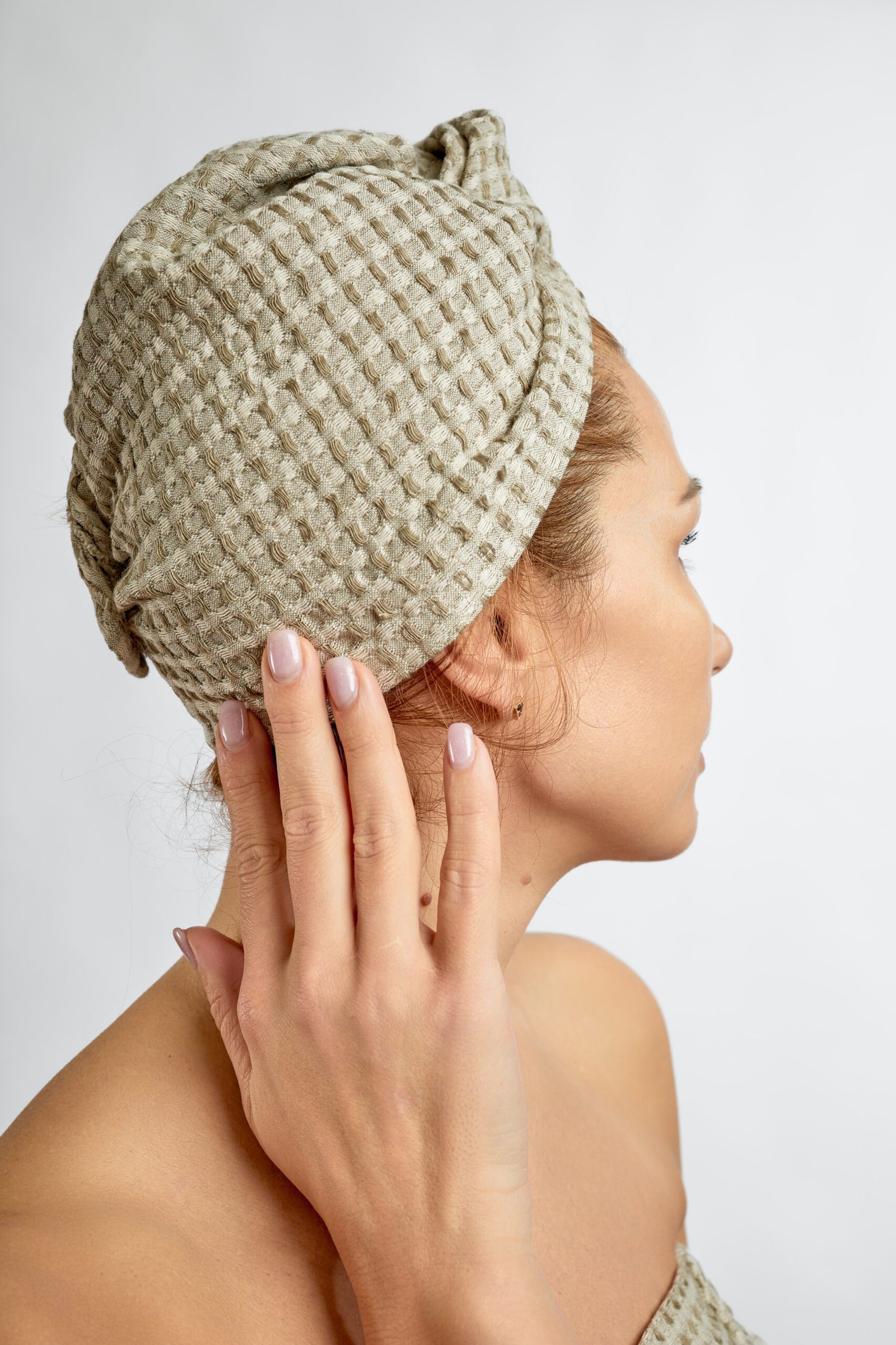 Of waffle grey Colors of linen and cotton fabric made of a towel on the head, also called turban, perform two functions: absorbs the moisture of the hair after head swelling, without damaging the hair, as well as comfortable for use in the sauna as a sauna Hat (especially for long hair whose protection of traditional Sauna Hats is usually too small). This functional head towel does not electrical and does not cause allergies, has antiseptic properties, and the universal, sagute adjustable size makes it comfortable to clog the head and does not slip from it. Two types of head towel can be used: