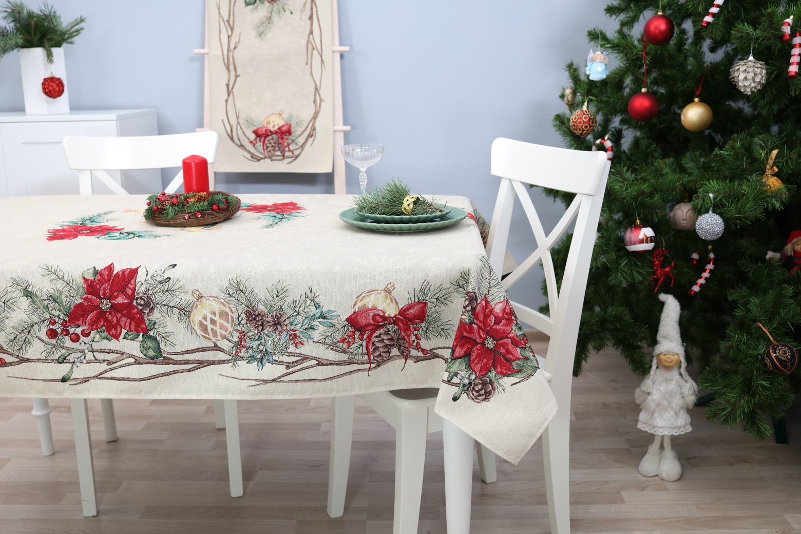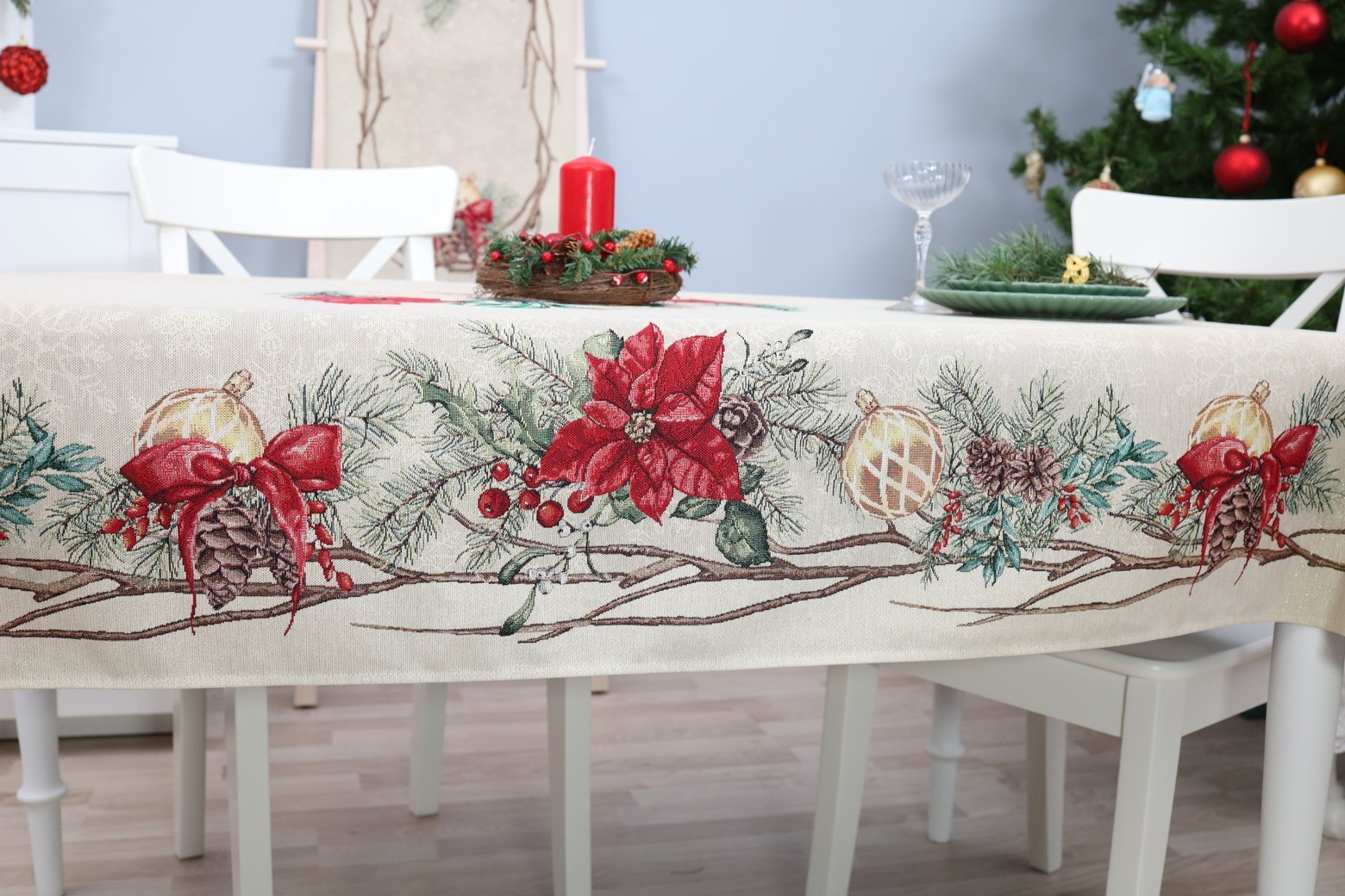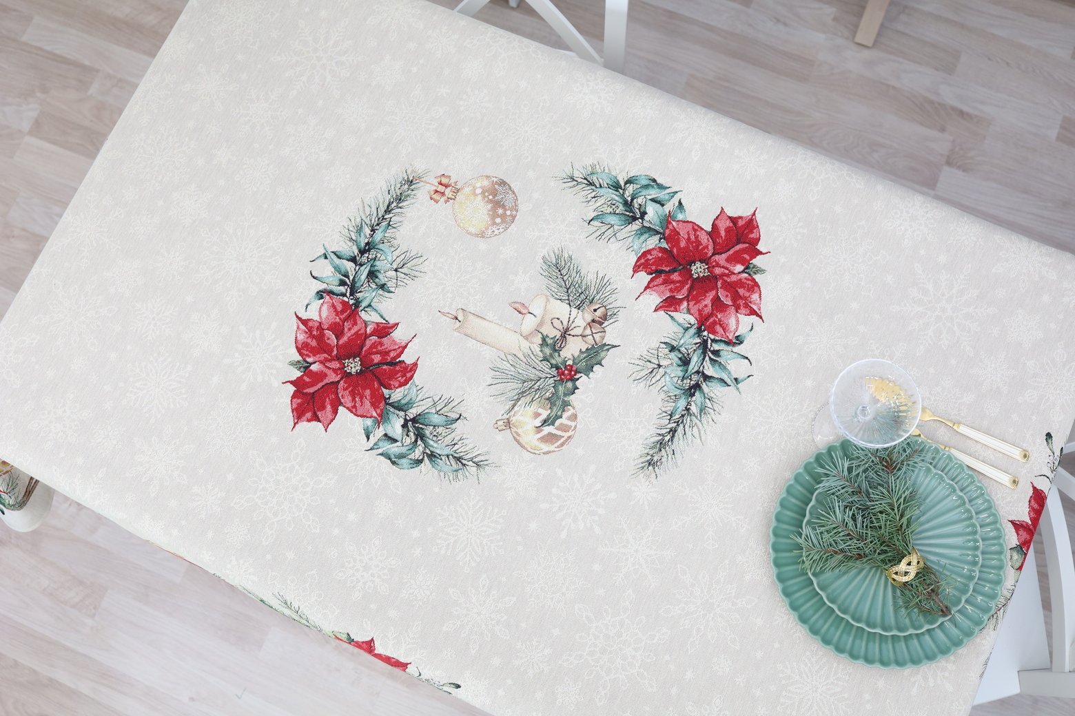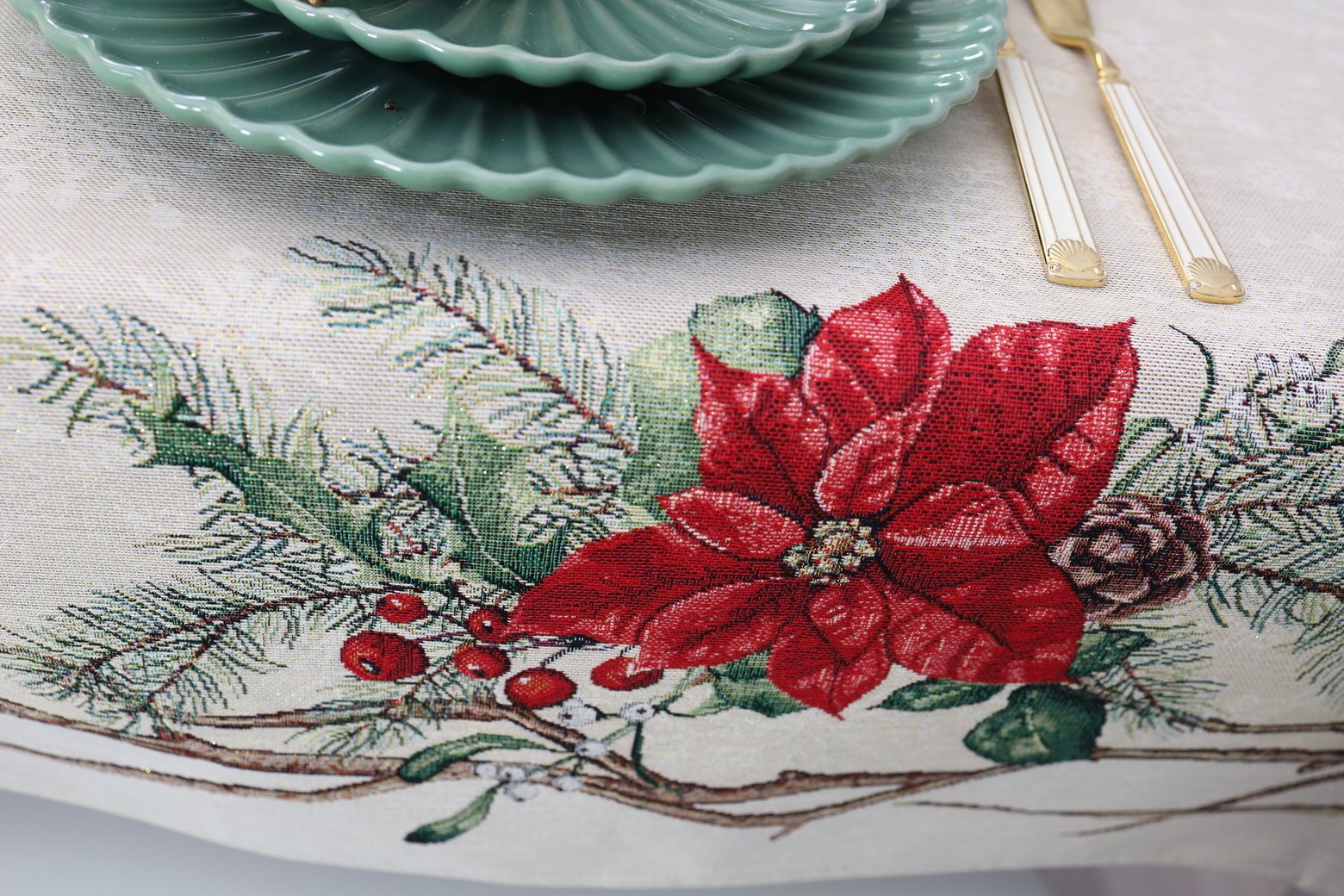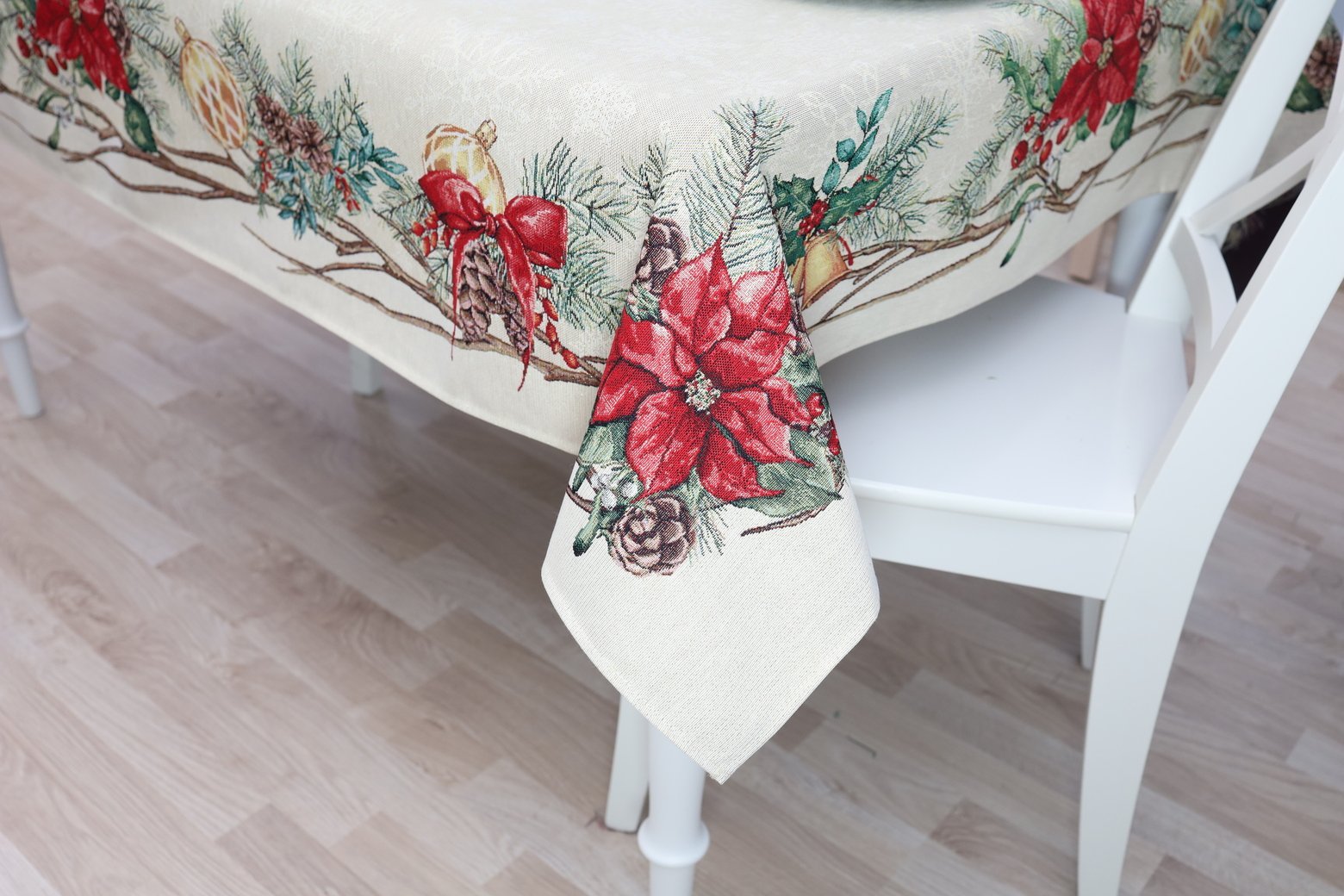 Decorative, elegant, solid tapestries Christmas table with Winter Accents decorated with Christmas flower motifs. This is a wonderful, delicate and memorable Christmas present. This table is accompanied by table wipes, table tracks and decorative pillows from the same collection. We invite you to look at other items of this collection and choose a set to decorate the interior of the house according to your needs. You will find Christmas table napkins whereThe table tracks of different sizes are in this shelves, o decorative pillow covers where. Maintenance: It is recommended to clean the table with dry chemical cleaning. In an automatic washing machine, the fabric can be washed at a temperature not exceeding 30 degrees without the use of bleach and chlorine-containing washing agents. Gobelenic tissue must be naturally dried, it is important not to dry, and cannot be dried in an automatic dryer. It is recommended to compare not more than 110 degrees. Made in the European Union. In reality, the shades of the products may differ slightly from those of the photographs due to different settings of the computer colours, brightness and darkness, contrast settings.